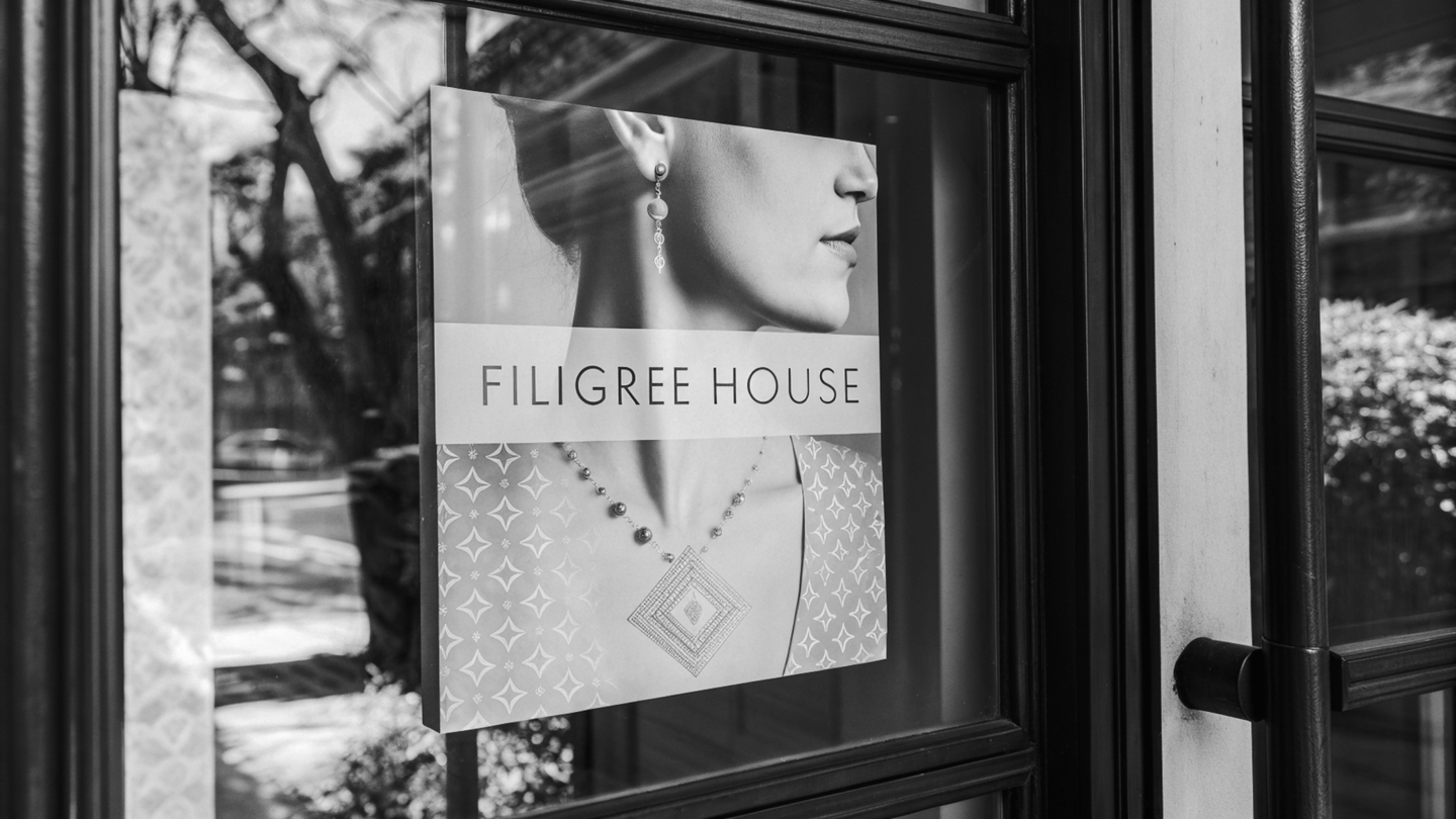 prompt: Create a posters on mockup on the white wall for the filigree jewelry brand «FILIGREE HOUSE» using black, white and silver colors and add a lot of small text, making the poster look more like a real one, modern style