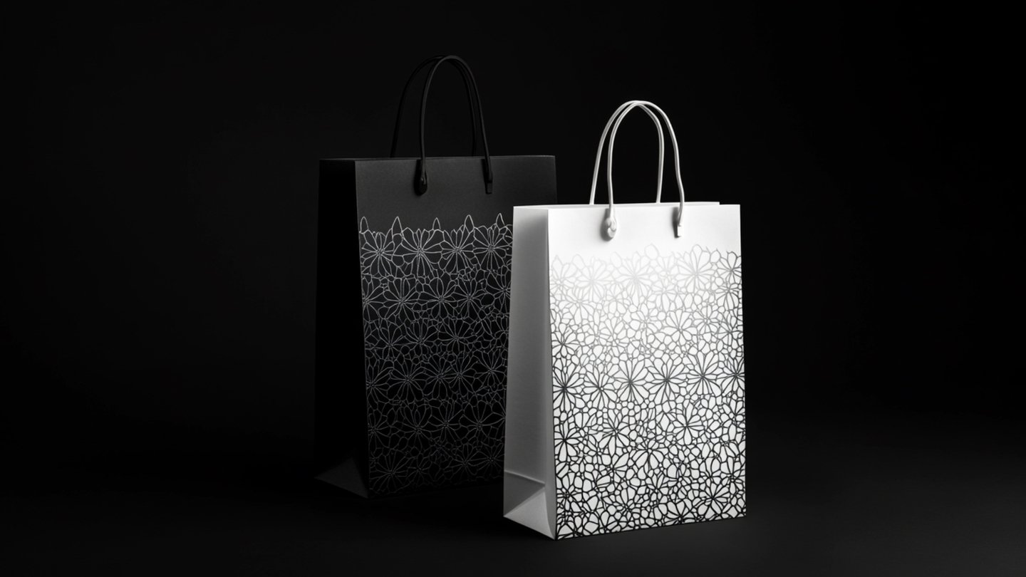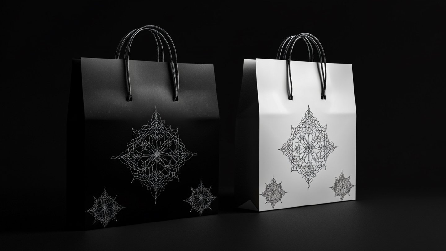prompt: generate a mockup of black and white paper bags on black background for the for filigree jewelry brand using silver, white and black colors, filigree geometry ornament, modern design