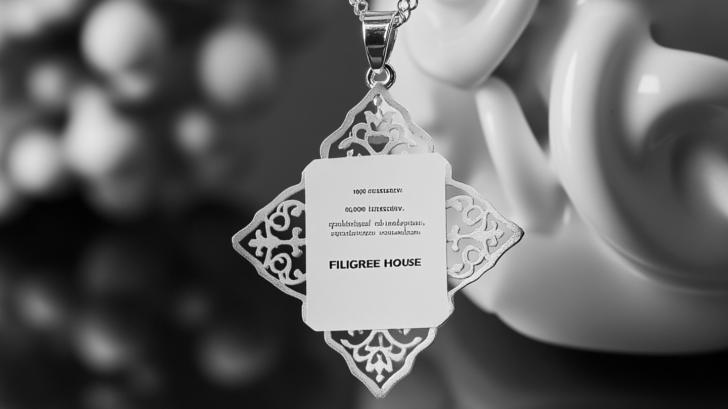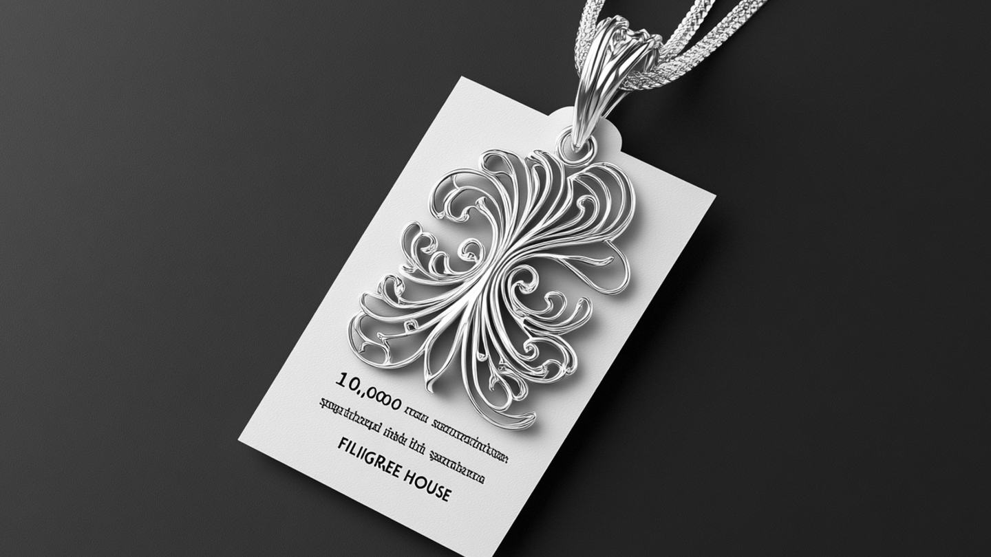 prompt: generate a modern white paper label for filigree jewelry. the label says «10,000 рублей. подвеска из серебра» and the brand name " FILIGREE HOUSE». The label is attached to a silver pendant in the form of filigree