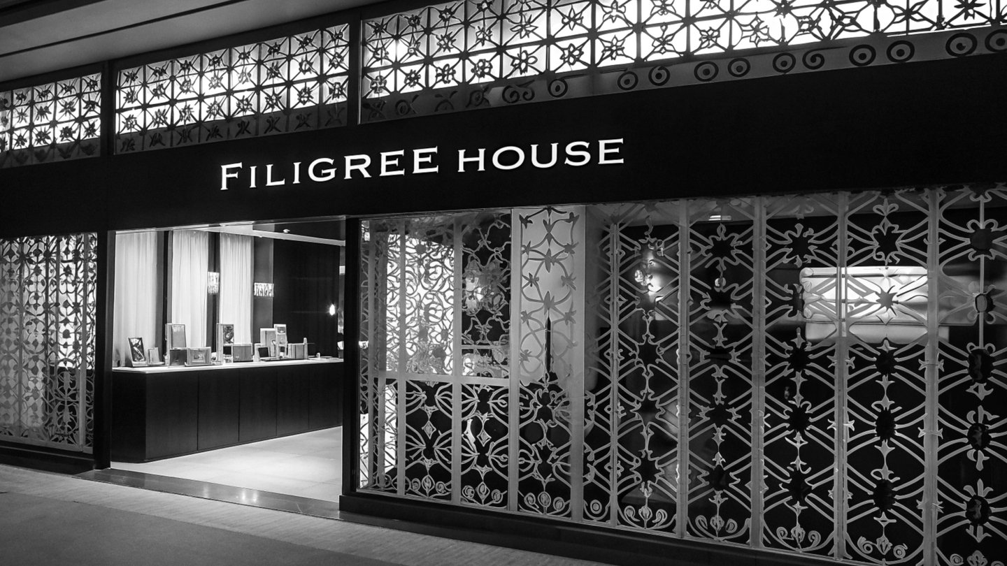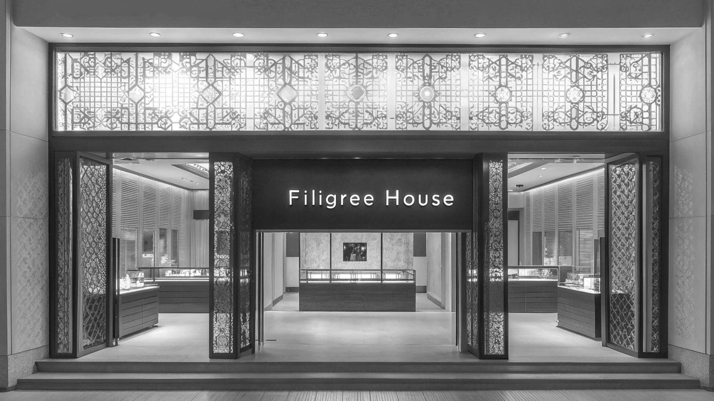 prompt: Create an interior of a premium shop of modern filigree jewelry store in black and white colors called «FILIGREE HOUSE»