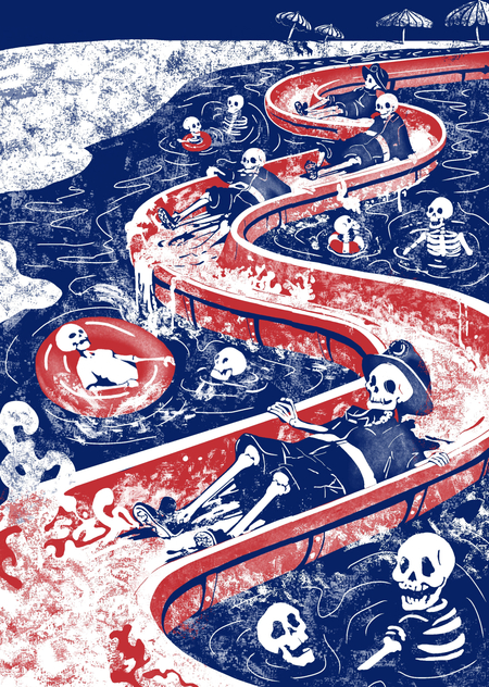 Графическая серия «Пенная бригада» состоит из трех иллюстраций для бренда пива Pabst Blue Ribbon. В проекте героические дисциплинирован- ные образы пожарных противопоставляются безза- ботной, хаотичной атмосфере пивных вечеринок, создавая ироничный комментарий к теме освобож- дения от общественных норм. Благодаря помеще-нию скелетов в игривую и расслабленную обста- новку, иллюстрации нарушают ожидания зрителя, подчеркивая радость ухода от ответственности. Это противопоставление служит метафорой напря- жения между долгом и желанием, акцентируя аб- сурдный юмор в отказе от рутины ради спонтанно- го удовольствия и новых впечатлений.