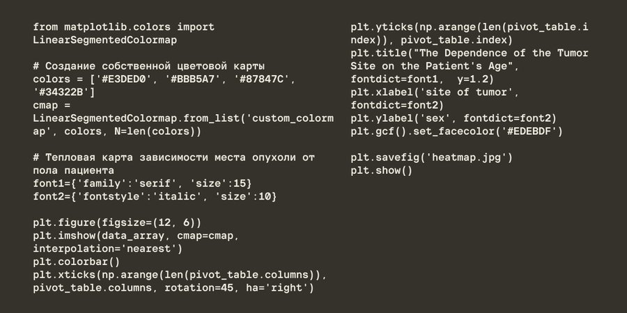 Потом с помощью Chat-GPT подготовила данные для создания тепловой карты. Используя метод .pivot_table, я создала сводную таблицу, которая потом использовалась для матрицы. Индексы в таблице — пол пациентов (sex), а столбцы — место расположения опухоли (anatom_site_general_challenge). Функция size используется для подсчета количества пациентов, а fill_value помогает заполнить отсутствующие значения.