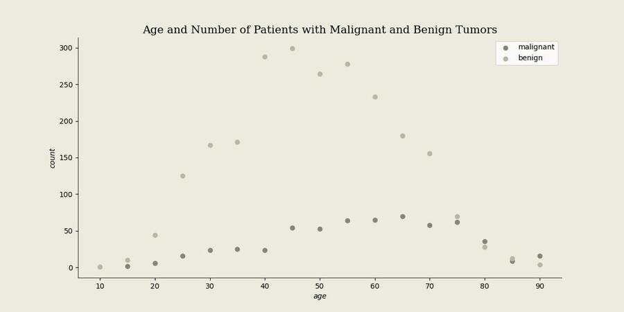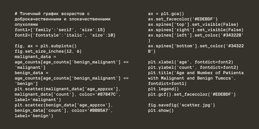 Для создания точечной диаграммы я применяла группировку по возрасту (age_approx) и характеру опухоли (bening_malignant). С помощью функции .size () подсчитывается количество пациентов.