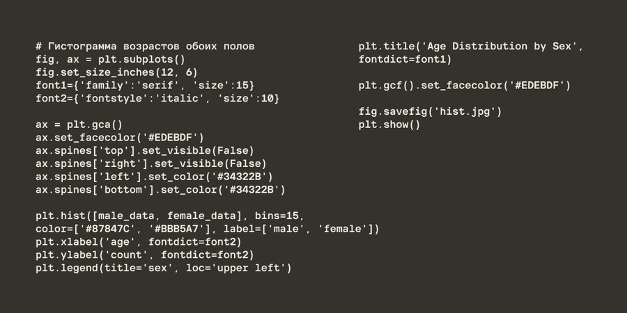 Далее обработала данные для гистограммы. В переменную male_data сохраняла значения возраста, если в столбце sex был указан мужской пол. Похожую операцию сделала с переменной female_data.