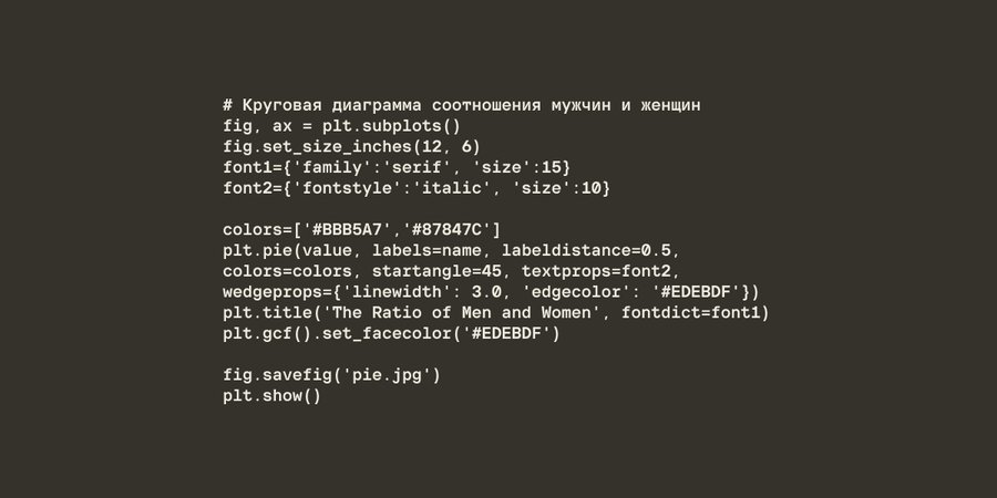 После чего приступила к подготовке данных для круговой диаграммы. Переменную name использовала для информации о поле пациентов (female и male), а value — для подсчета количества упоминаний каждого пола.