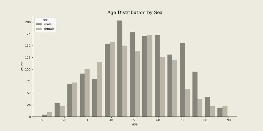 С помощью гистограммы понятно, что больше всего онкологическим кожным заболеваниям подвержены люди от 45 до 60 лет. Количество пациентов-мужчин превалирует почти в каждой возрастной группе.