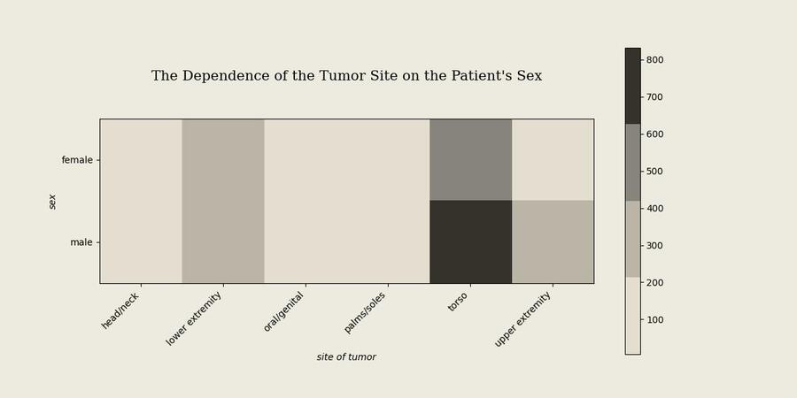 Тепловая карта демонстрирует, что наиболее часто новообразования на коже возникают в области туловища (живот, спина, грудь, таз). Также из этой матрицы видно, что количество мужчин-пациентов с новообразованиями превышает количество женщин.