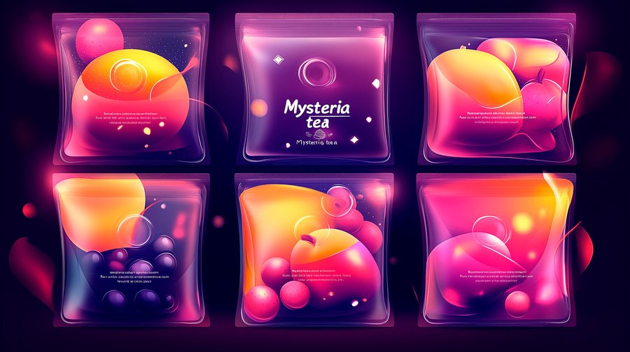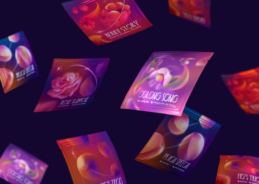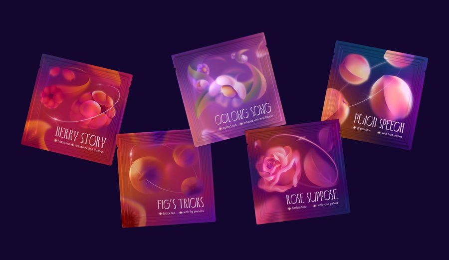 Промпт: A photo of five square-shaped illustrated tea sachet on a dark background. Top view. The illustrations depict fruits or berries and have a mysterious look. Soft and flowing shapes and shadows. Lots of gradients and highlights. Soft purple, yellow, orange and blue colors. One package has the brand name «Mysteria tea» on it. --ar 16:9