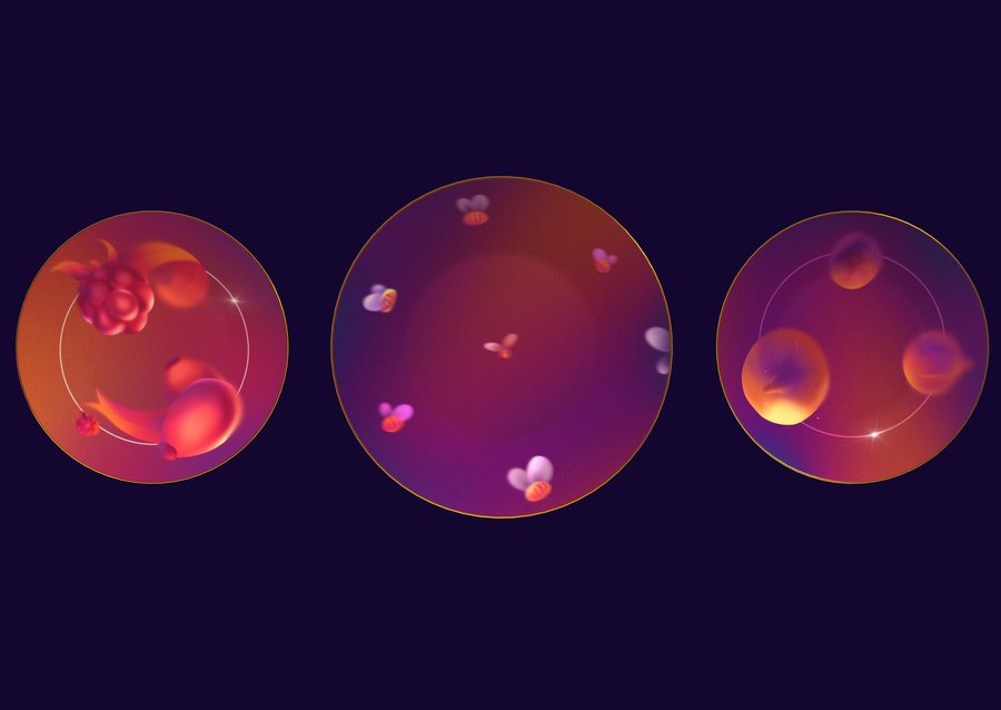 Промпт: photo of three porcelain saucers with illustrations of fruit or berries on each. Solid black background. Top view. Soft and flowing shapes and shadows. Lots of gradients and highlights. Soft purple, yellow, orange and blue colors. Fancy and mysterious look. --ar 16:9