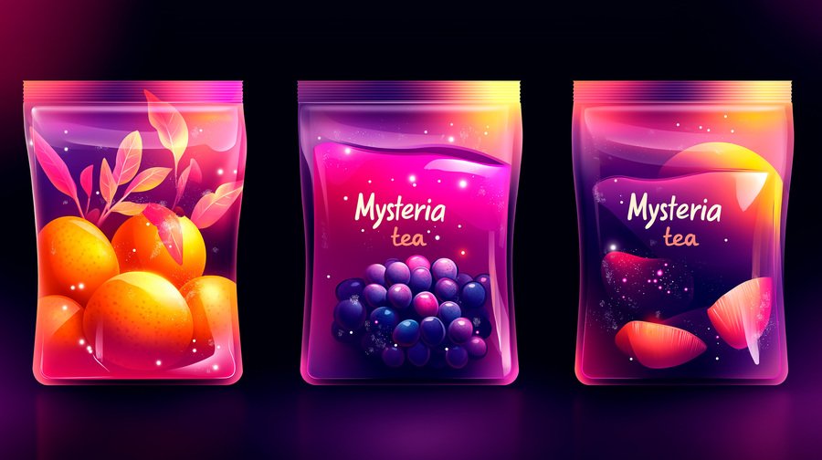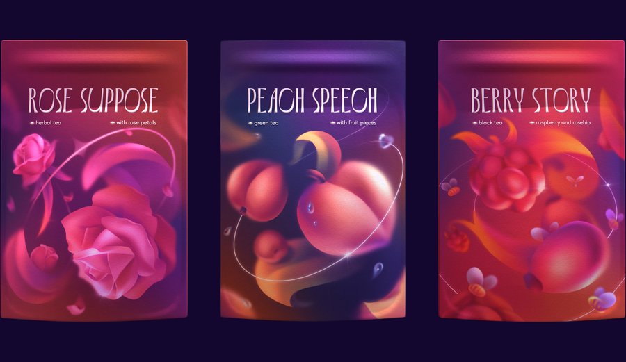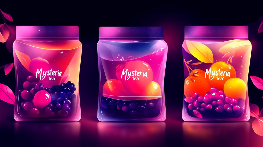 Промпт: A photo of three illustrated packages of loose leaf tea on dark background. The illustrations depict fruits and berries and have a mystical and mysterious look. Soft and smooth shapes and shading. Lots of gradients and highlights. Soft purple, yellow, orange and blue colors. Each package has the brand name «Mysteria tea» on it. --ar 16:9