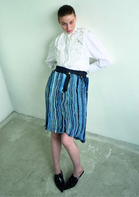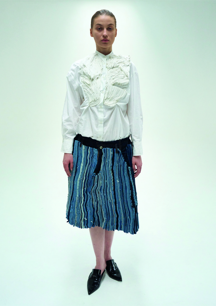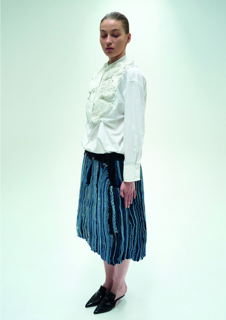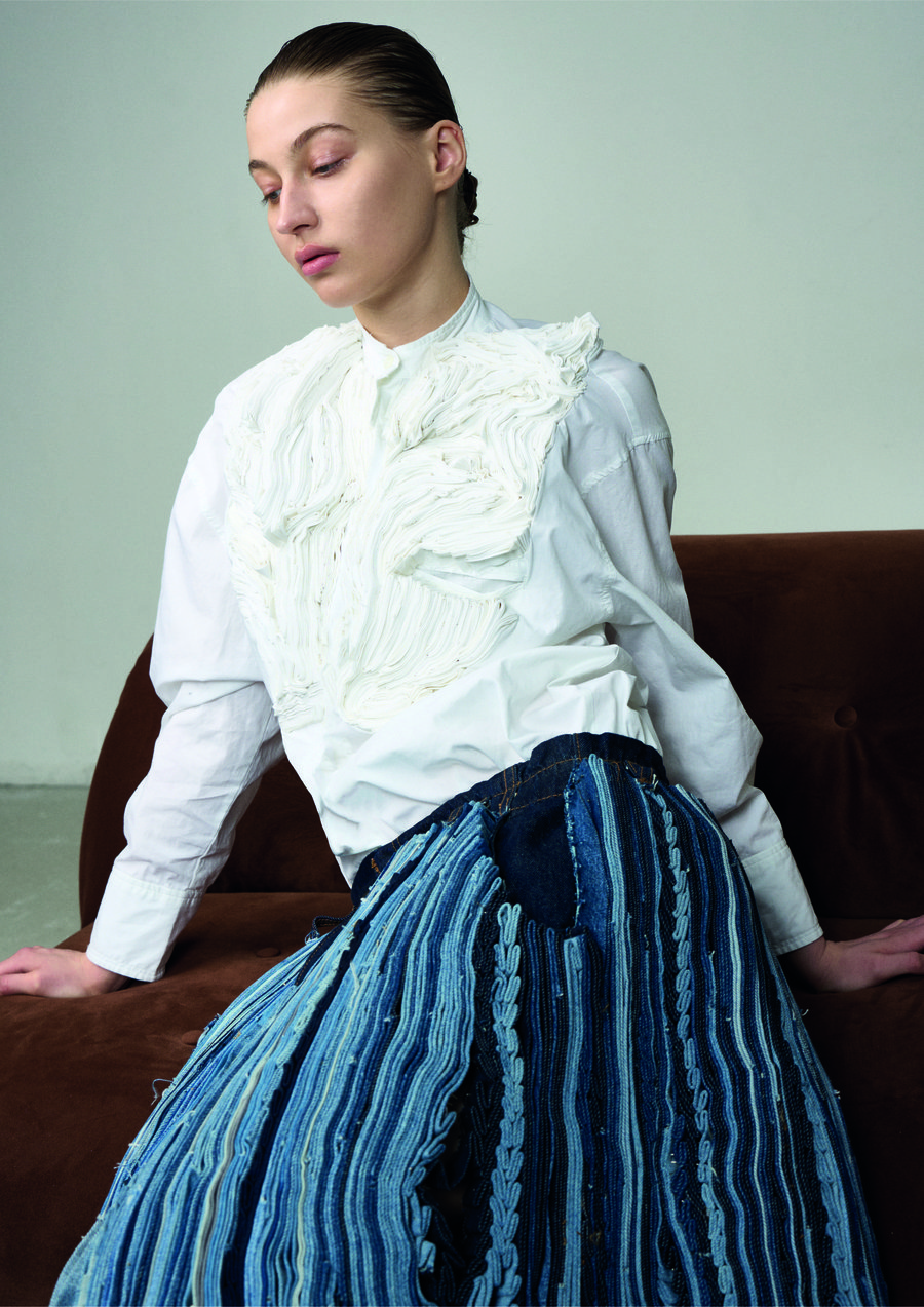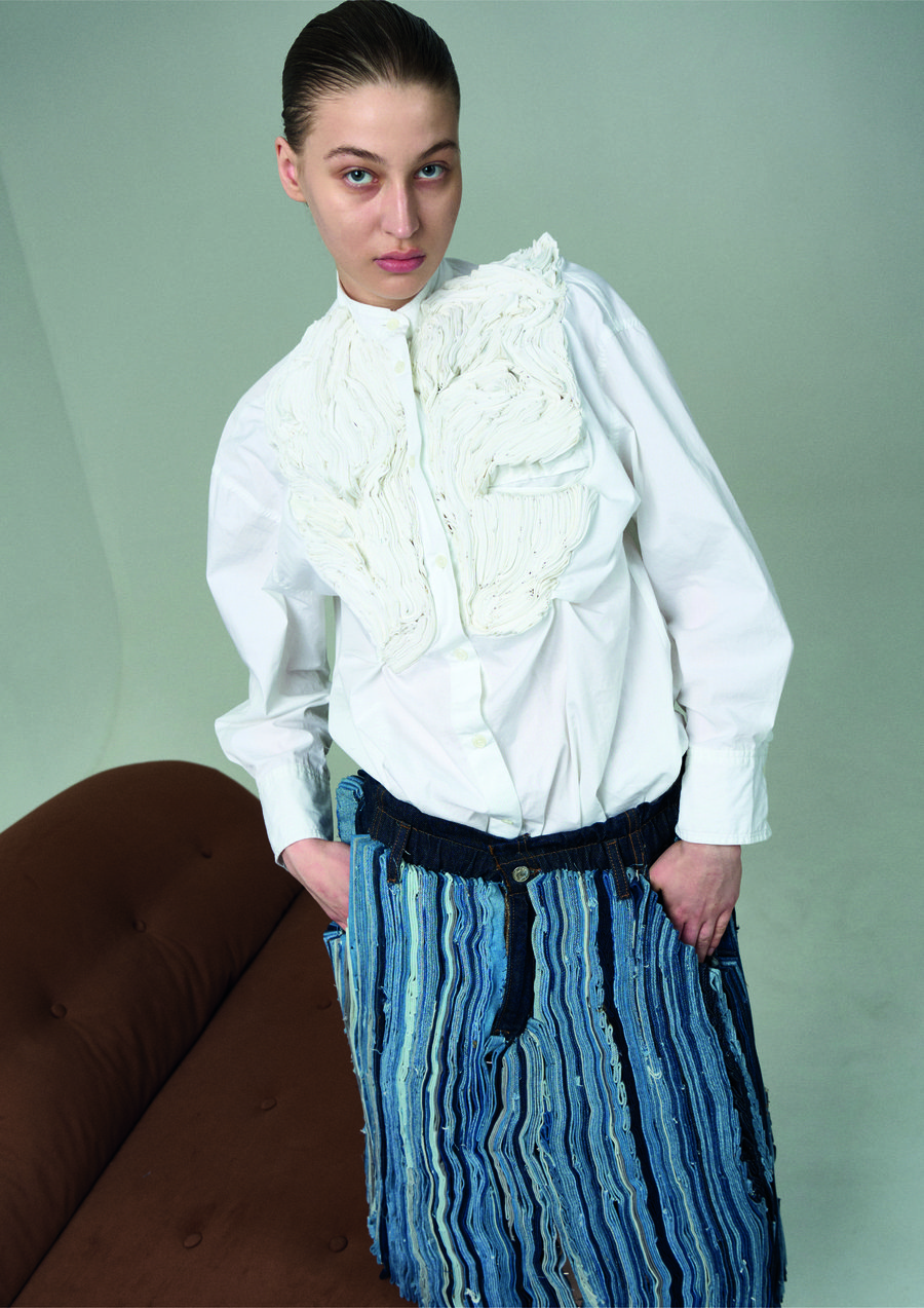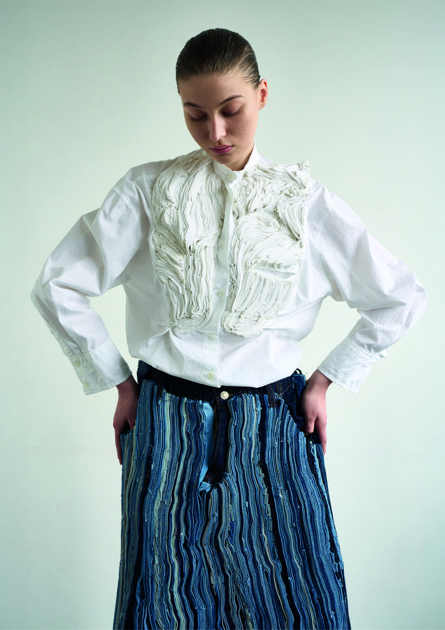 Коллекция основана на феномене упрощения гардероба для экономии когнитивных ресурсов: минимальный набор однотипных вещей освобождает умственные силы для важных решений. В коробке MAAG я обнаружила стопку белых рубашек и синих джинсов, сложенных слоями, и перенесла этот приём в дизайн, где каждый слой создаёт объём и текстуру, отражая идею повторения. Герой коллекции — человек, уставший от бесконечного выбора, ценящий лаконичность и практичность, но ищущий новую форму самовыражения через устойчивый апсайкл привычных вещей.
