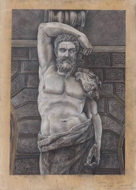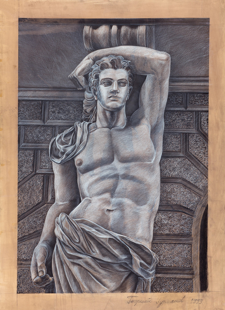 Бюсты римских императоров и портретная статуя обнаженного мужчины вступают в визуальный диалог с атлантами Гурьянова (справа и слева). Эстетизация изображения тела перешла из греческой традиции в римскую и до сих пор встречается в окружающей нас архитектуре. Атланты Гурьянова получают новую интерпретацию и скорее напоминают застывших в определенной позе людей, нежели чем греческих богов или римских императоров.