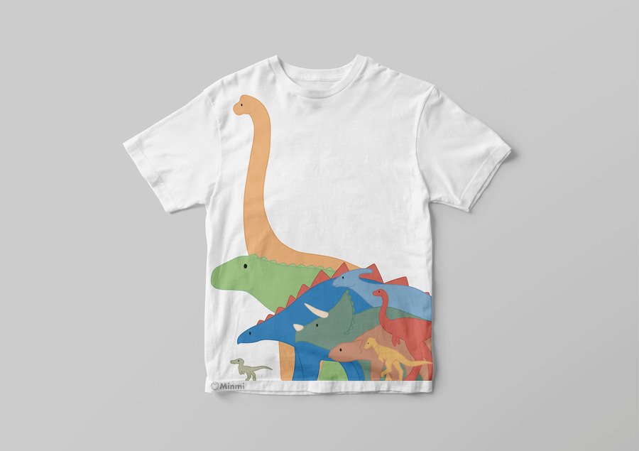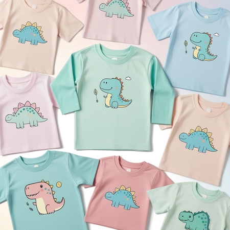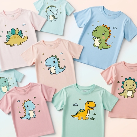 Промт: colorful t-shirts featuring dinosaur characters to sell as merchandise for children and parents.