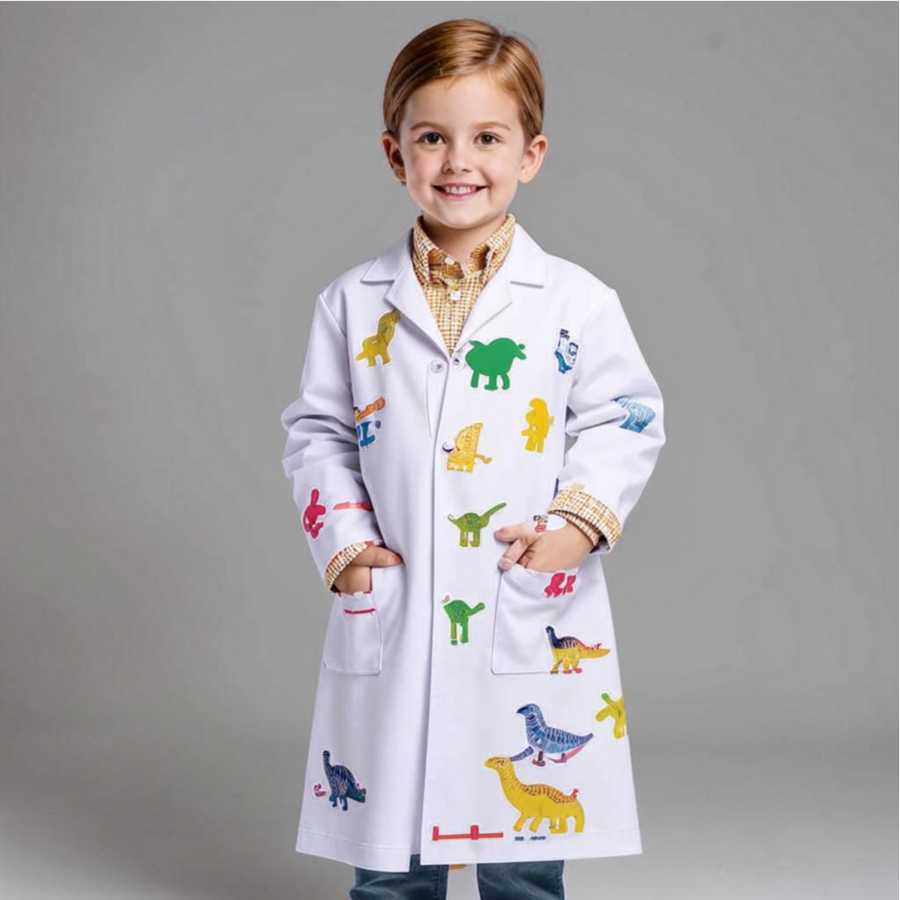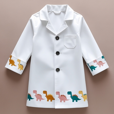 Промт: a white doctor’s coat with adorable minimalist dinosaur prints along the hem and cuffs. The coat should have a soft and comfortable fabric, with buttons down the front for closure. The dinosaur prints should be colorful and child-friendly, adding a fun touch to the traditional medical garment.
