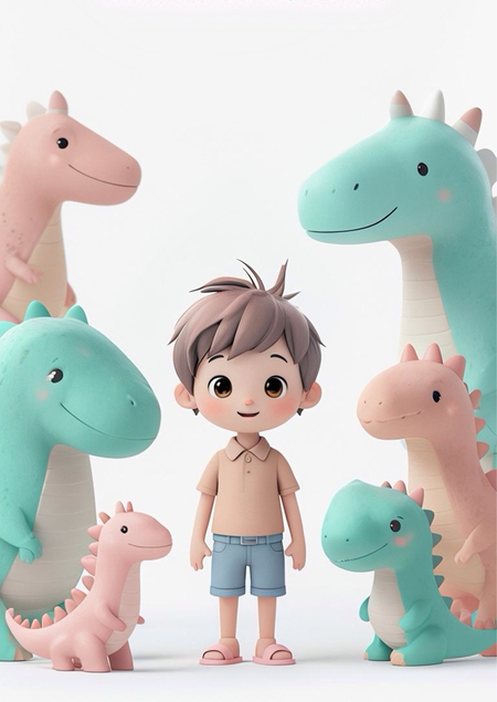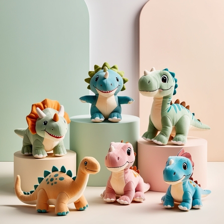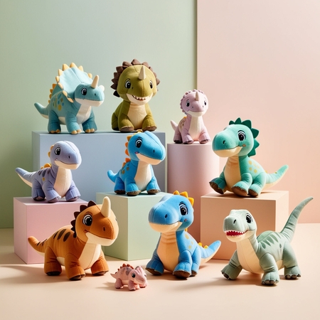 Промт: a range of dinosaur plush toys and figurines featuring other friendly dinosaurs for children to play with and take home as a souvenir.