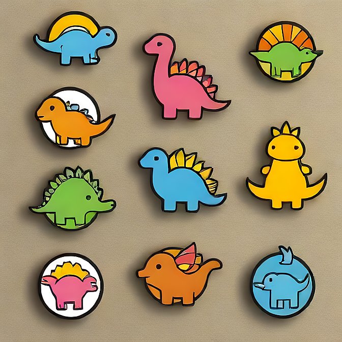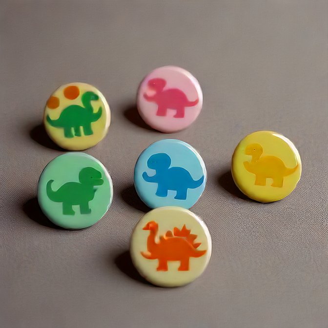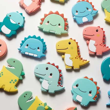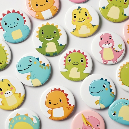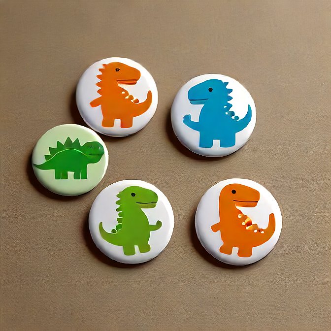 Промт: cute dinosaur-shaped badges for children to collect and wear proudly.