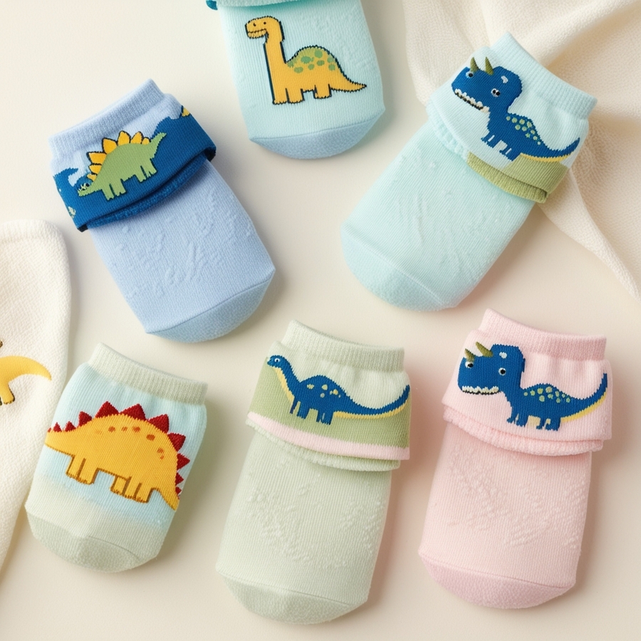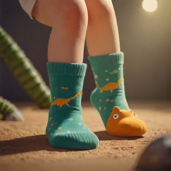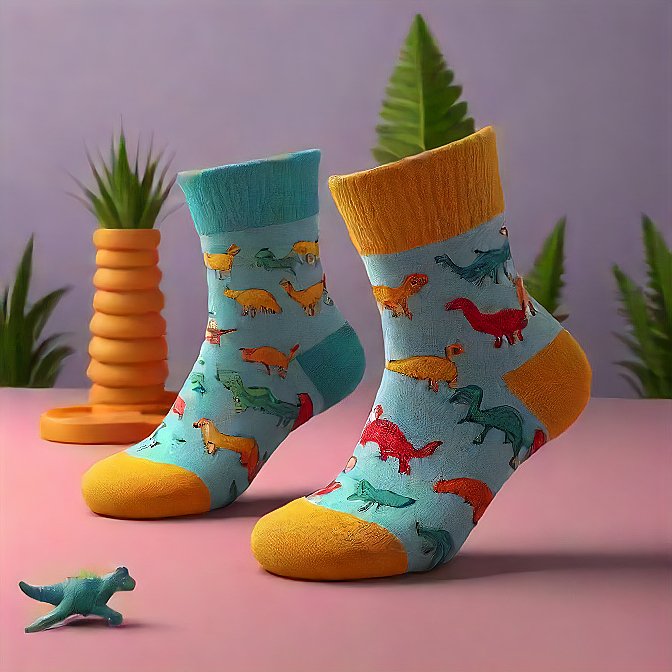 Промт: fun dinosaur-themed socks with different dinosaur patterns for children to wear and enjoy.