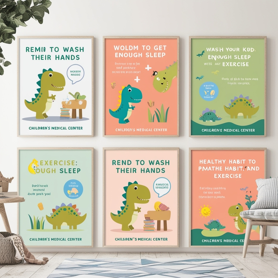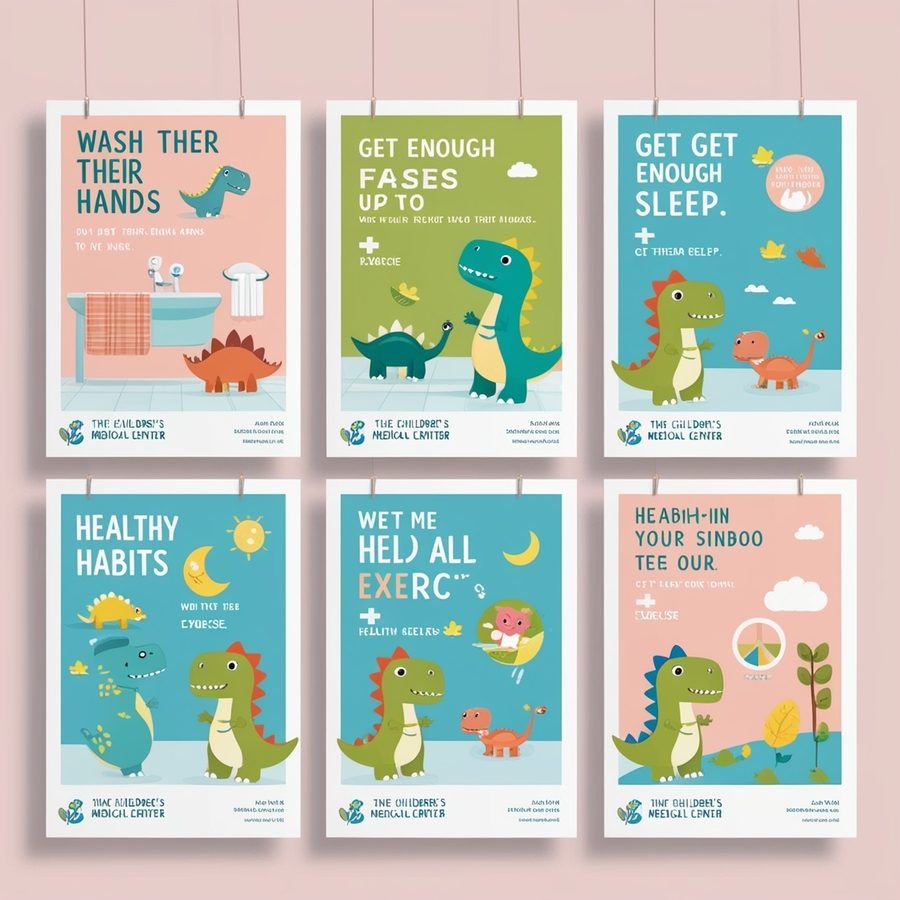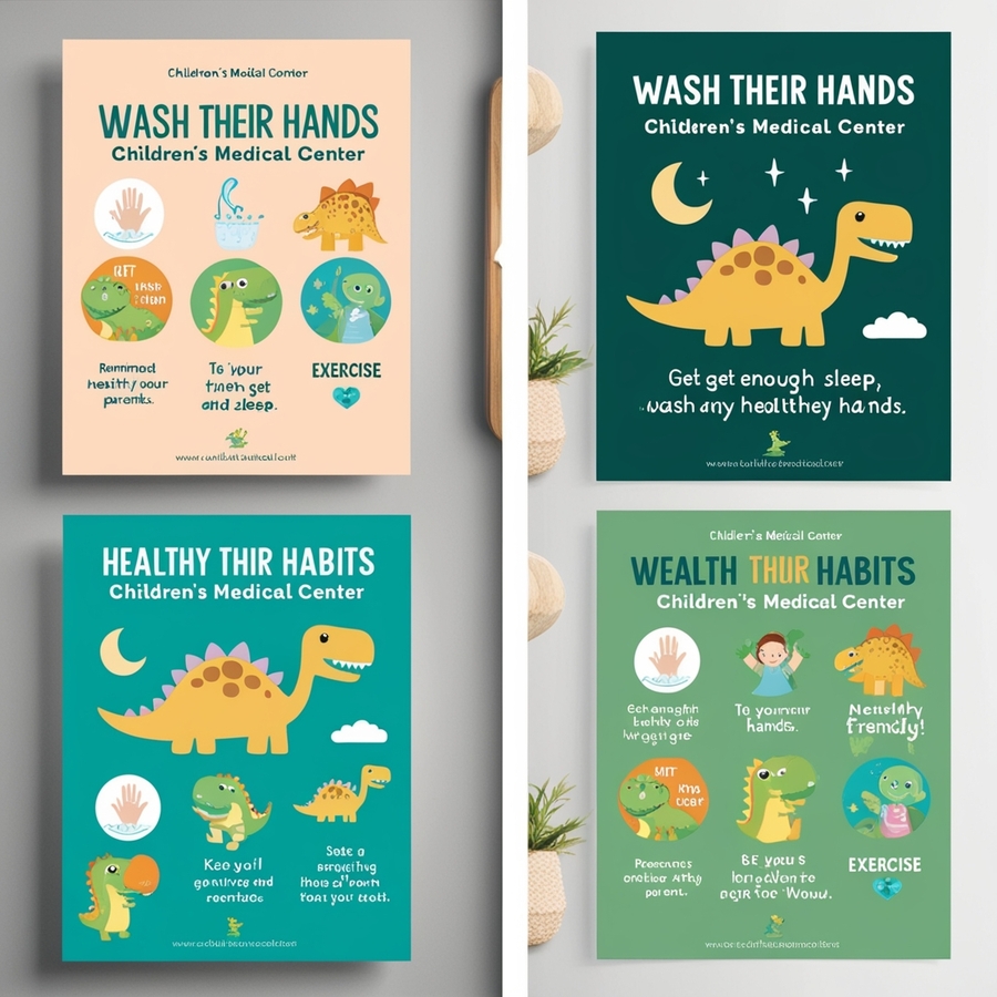 Промт: creative and eye-catching poster designs and illustrations for a children’s medical center. The brand’s symbol is adorable little dinosaurs in a minimalist style and pastel colors. The posters should feature messages reminding kids to wash their hands, get enough sleep, exercise, and other healthy habits. The designs should be appealing to both children and their parents, incorporating fun and colorful elements to make the medical center feel welcoming and friendly. The focus should be on promoting healthy habits in a playful and engaging way that will resonate with kids. Let your imagination run wild and create unique and attractive designs that will capture the attention of both children and parents!