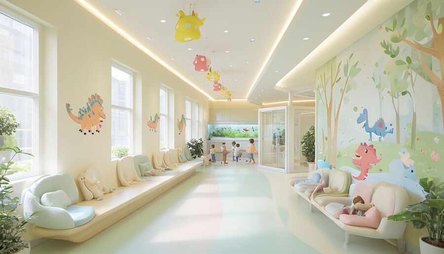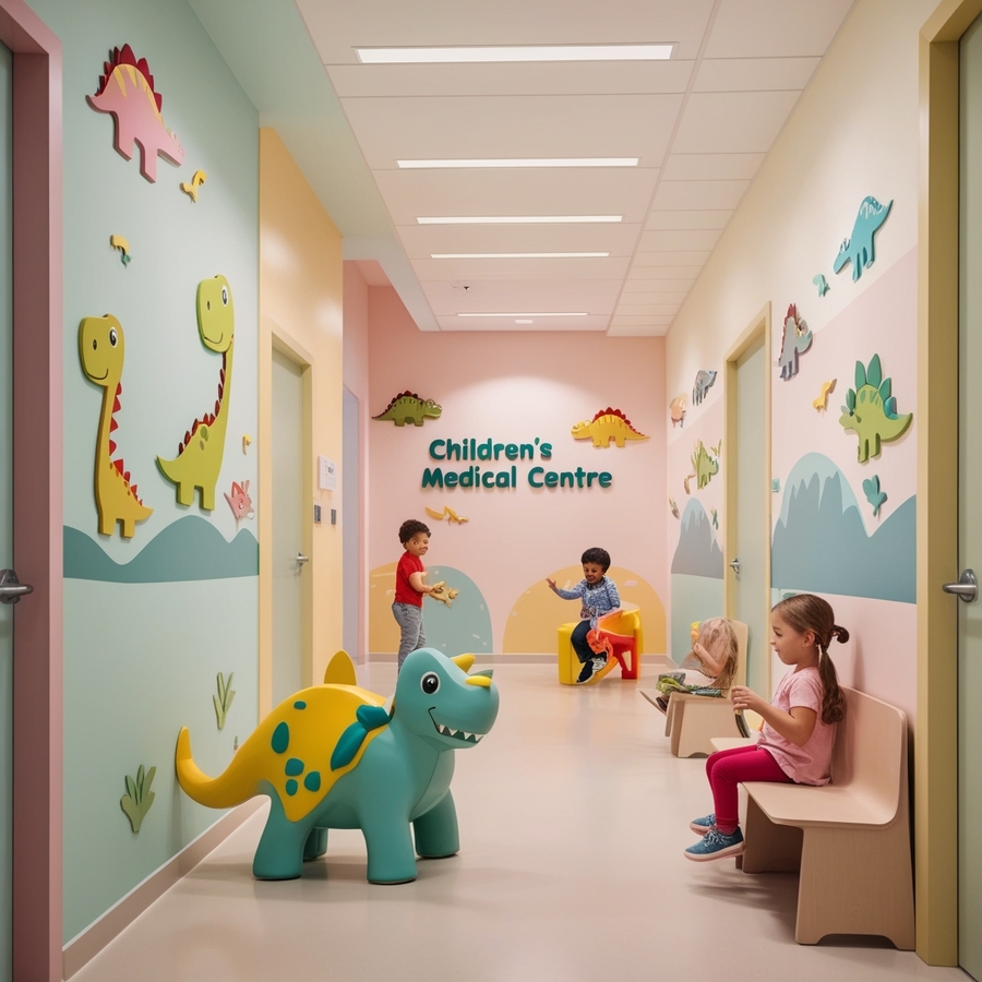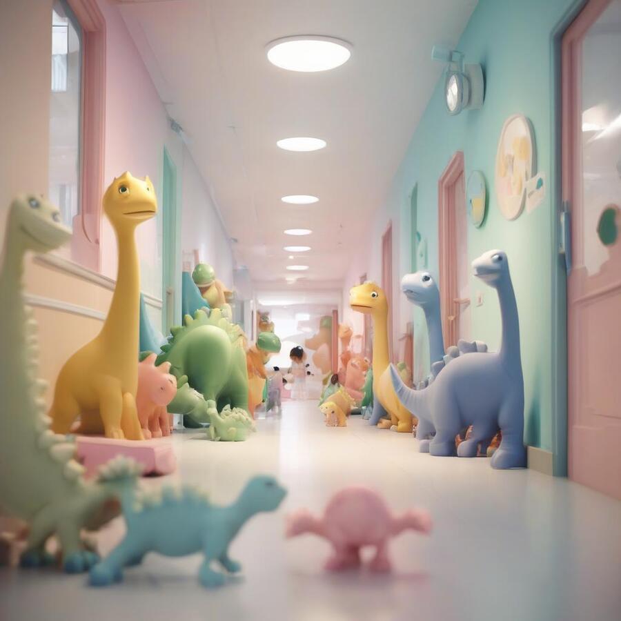 Промт: The corridor of a children’s medical centre. Comfortable and friendly atmosphere, calm pastel colours. Cute dinosaurs are drawn on the walls. Children are playing and having fun while waiting for the doctor.