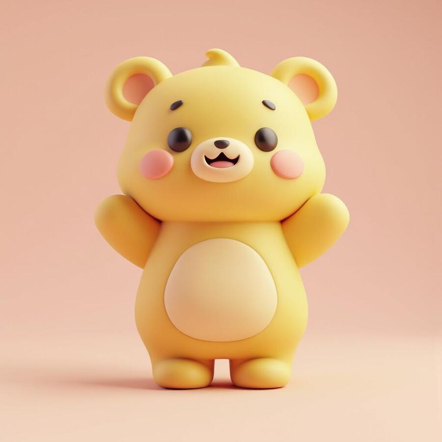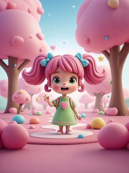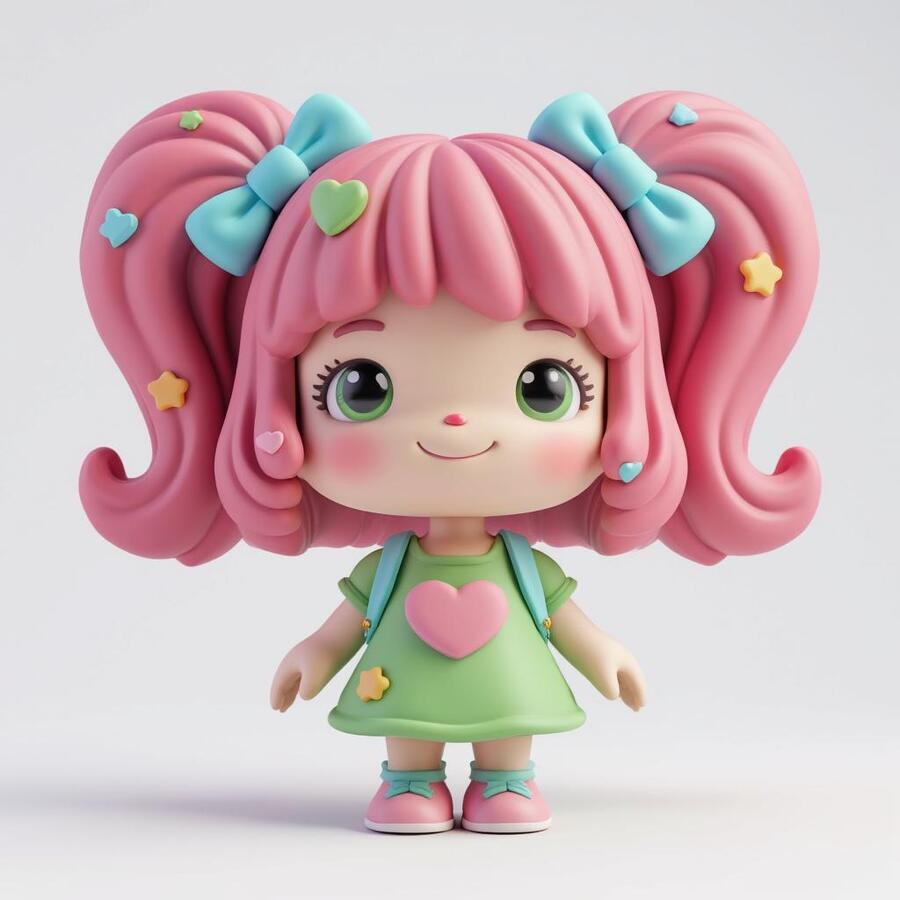 3. 3D render of a full-body figurine of a teenage girl, vibrant pink thick hair, large pigtails, colorful accessories, heart-shaped clips, candy decorations, large blue bows, green eyes, cheerful expression, simple green dress, pink heart emblem on the chest, cartoonish style, exaggerated proportions, glossy texture, dynamic pose, smooth shapes, collectible, plastic material, board game piece, standing pose, sturdy, vibrant colors, detailed hair, playful design, simple background. 4. 3D render of a full-body figurine of a cartoon-style bear, yellow fur with a soft peach-pink gradient on the ears, paws, and legs, rosy blush on the cheeks, round and chubby proportions, smooth and glossy texture, cheerful and friendly expression, playful pose, sturdy design, collectible plastic material, board game piece, vibrant colors, detailed fur texture, simple background, exaggerated features, cute and charming appearance.