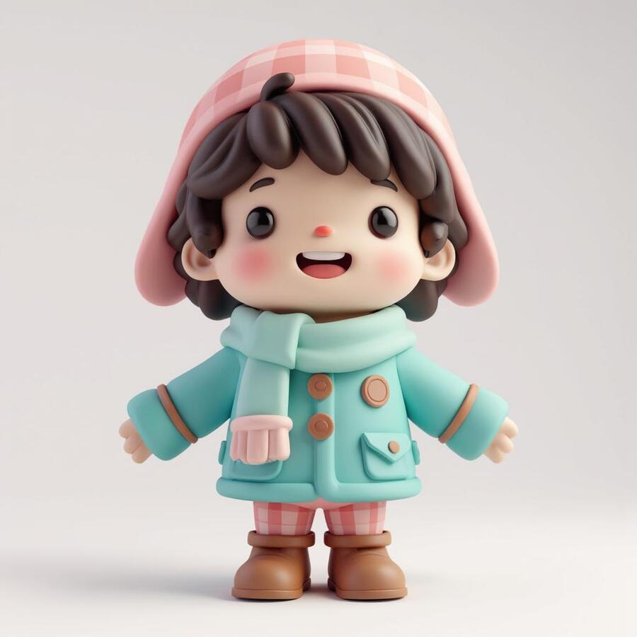 1. 3D render of a full-body figurine of a cartoon-style teenage boy, chestnut brown hair styled in a bob cut, wearing a pink checkered ushanka hat with ear flaps, turquoise coat, light turquoise scarf with a gradient fading to white, matching turquoise mittens, pink checkered pants, brown boots, cheerful and friendly expression, smooth and glossy texture, sturdy design, vibrant colors, exaggerated proportions, collectible plastic material, board game piece, dynamic yet stable pose, simple background, cute and charming appearance, playful and detailed design. 2. 3D render of a full-body figurine of a cartoon-style whimsical creature, light purple fluffy body with a watercolor texture, round head and body shape, small black oval eyes, thin black whiskers on each side of the face, two long black floppy ears, playful and quirky appearance, simple black stick-like legs, faint pink and blue spots on the body, cute and minimalistic design, smooth matte finish, board game piece, stylized and charming, vibrant yet soft colors, clean white background.