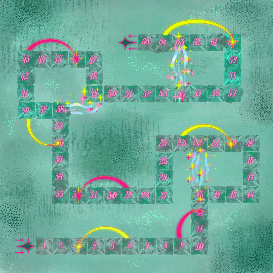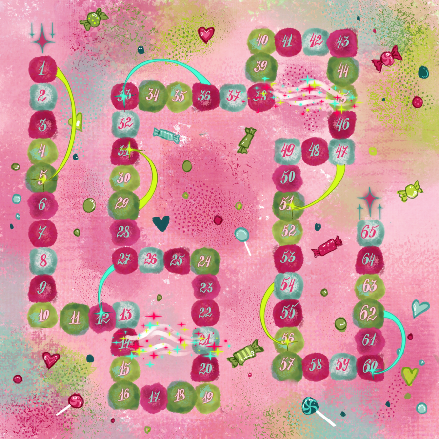 3D render of a board game map depicting a magical candy forest. The ground is covered in soft pink grass, with winding paths made of large, colorful gummy candies forming the trails. Trees and plants are whimsical and vibrant, with enchanted colors like pink, turquoise, and sky blue, resembling swirls of candy. Scattered across the grass are treats such as lollipops, candy canes, and wrappers, adding playful details to the landscape. The map includes intricate elements like candy bridges, hidden traps, glowing stars, and other magical markers, making the environment feel interactive. The overall atmosphere is bright, cheerful, and dreamlike, with a pastel color palette and soft reflections on the candy-coated surfaces. The design captures the playful and enchanted feel of a whimsical candy forest adventure