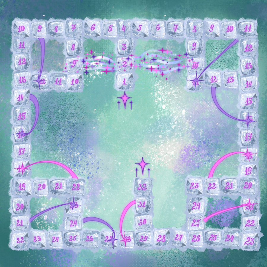 3D render of a board game map depicting a magical winter forest. The game paths are illustrated as shimmering ice floes that form a winding trail across the map. Surrounding the paths, everything is frosted and covered in delicate snow, with gentle snowfall drifting through the air. The map includes small, detailed elements such as icy bridges, hidden traps, glowing stars, and mystical symbols scattered throughout the terrain. The visual style is dreamy and whimsical, with a pastel color palette: soft light blue, pale lavender, and gentle turquoise. The overall atmosphere feels serene and magical, with frosted trees, subtle reflections on the ice, and soft light illuminating the snow-covered landscape. The design is intricate but clean, capturing the charm and wonder of a frozen forest adventure.