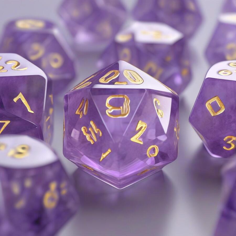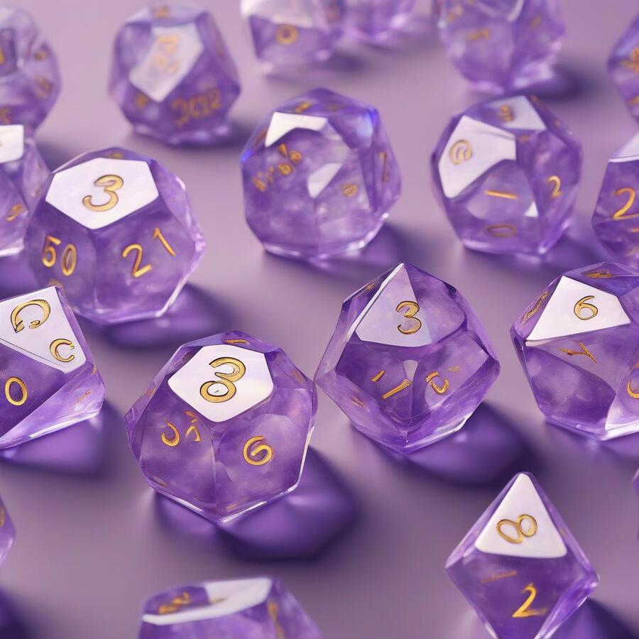 3D render of three 20-sided dice (d20) for tabletop games, made of transparent, crystal-clear material with a soft purple (lavender) tint. The dice refract light delicately, creating subtle rainbow effects on their edges. Each face of the dice is engraved with elegant golden numbers, standing out beautifully against the translucent lavender surface. The dice are placed on a smooth, pastel surface that reflects their soft purple glow and creates colorful, dreamy shadows. The overall lighting is soft, magical, and ethereal, enhancing the fantasy-inspired and enchanting atmosphere.