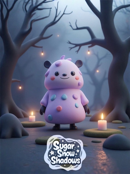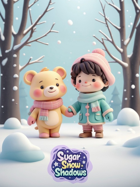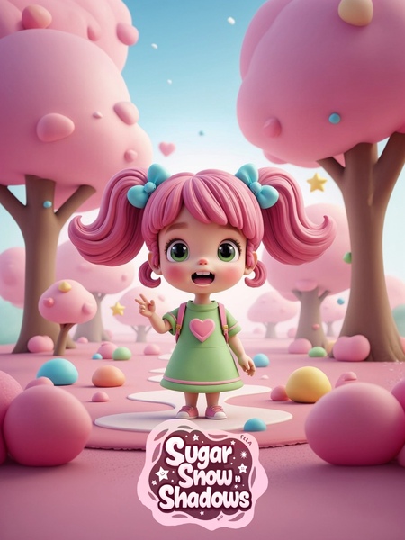 Incorporate thematic elements like sparkling stars, whimsical candy shapes (lollipops, swirls, or gumdrops), and delicate snowflakes. The word ‘Sugar’ should have a candy-like style with a glossy finish, ‘Snow’ should appear frosty and icy with glowing edges, and ‘Shadow’ should have a slightly dark, mysterious look with soft, subtle shadows around the text.