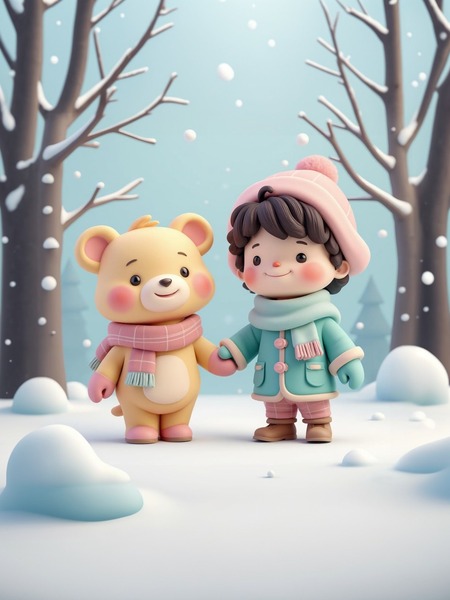 An illustrated poster featuring a whimsical winter scene with two main characters. The first is a yellow teddy bear with rosy cheeks and soft fur that transitions into a peach-pink gradient on its ears, paws, and legs. The second is a young man with chestnut brown bob-cut hair, wearing a pink plaid ushanka hat with ear flaps. He is dressed in a stylish turquoise coat, a light turquoise scarf with a gradient fading to white, matching turquoise mittens, pink plaid pants, and brown boots. They are holding hands and smiling warmly, radiating joy and friendship.