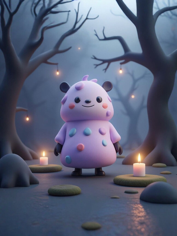 The background depicts a mysterious, shadowy forest illuminated by flickering candles placed on mossy stones. Ghostly fog drifts through the twisted trees, creating an unsettling yet magical atmosphere. Bright fireflies hover in the air, casting small orbs of light that contrast with the dark, ominous setting. The lighting is soft and moody, with glowing highlights from the candles and fireflies reflecting off the creature’s fluffy texture. The overall composition combines cuteness with mystery, making it both enchanting and slightly spooky.»