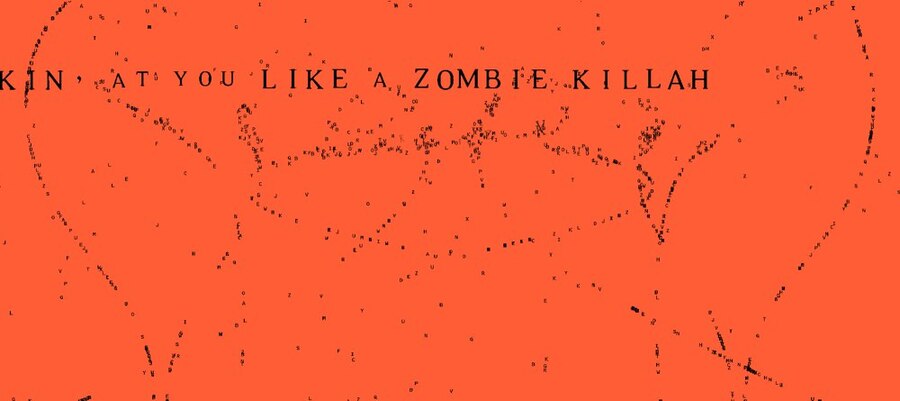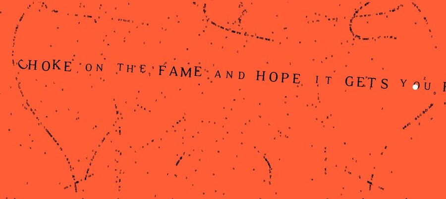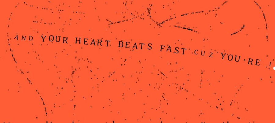 • Использование ярко-оранжевого фона привлекает внимание и вызывает ассоциации с тревогой, энергией и трансформацией. • Черные линии и точечные узоры, изображающие разбросанные линии и точки, создают ощущение хаоса, разломов и внутреннего беспорядка. • Разбросанные по экрану цитаты из песен усиливают ощущение личного диалога. Наклоненные, неровные буквы создают эффект нестабильности и эмоциональной напряженности, что делает восприятие более субъективным.