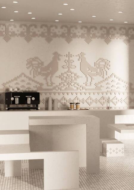 В кафе стоит единственный стол, перетекающий из барной стойки. Сделано это для того, чтобы посетители могли почувствовать, что сидят за одним столом и являются участниками «пира на весь мир».