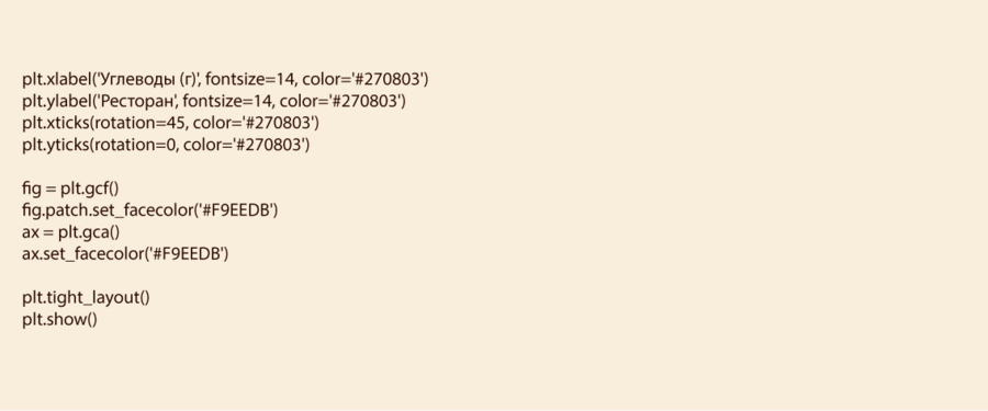 Как и ожидалось, углеводы доминируют практически во всех сетях ресторанов, и переваливают за 60%. Жиры, чаще всего, на втором месте: вкусный обед без сыра, масла и соусов — не вкусный обед.