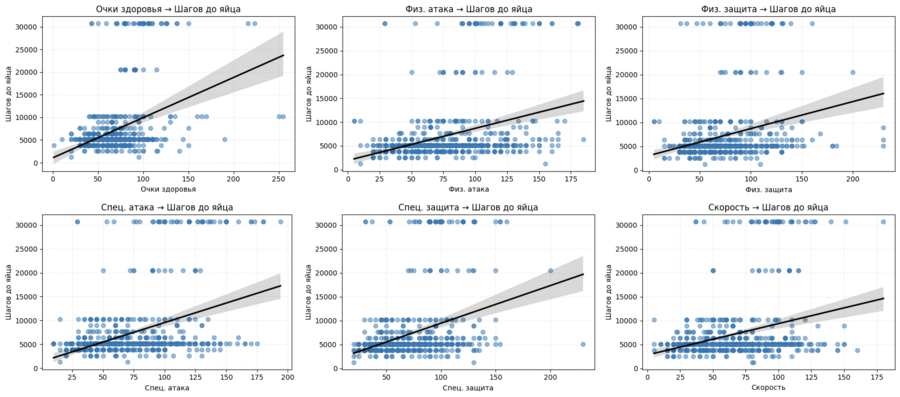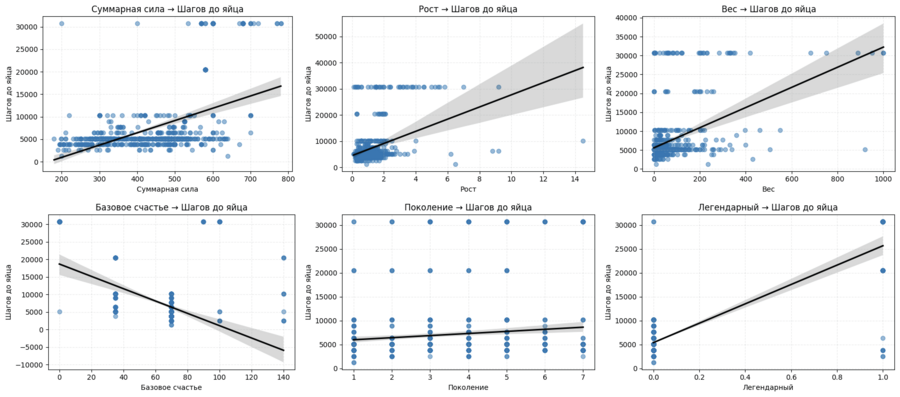 Сложность выведения и прокачки покемона действительно связана с его силой, размером и особенно — легендарностью. Чем сильнее и редкий покемон, тем больше шагов до вылупления и медленнее рост опыта. Также видно что счастливые покемоны (например, дружелюбные или эволюционирующие по счастью) вылупляются легче. Физические параметры (рост и вес) — важны, но не доминируют.