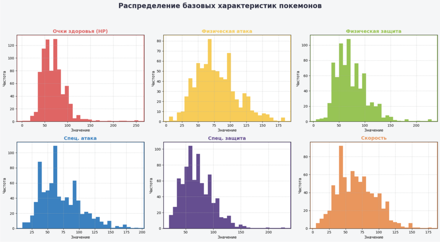 Большинство характеристик распределены неравномерно, с явными пиками в «средних значениях». Есть единичные мощные покемоны с высокими значениями (hp, attack, speed > 150), которые создают длинные «хвосты». Специальная атака и скорость — одни из наиболее разнообразных параметров среди популяции. Типичное значение большинства статов лежит в пределах 60–90.
