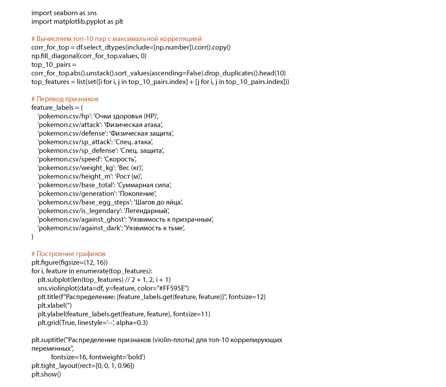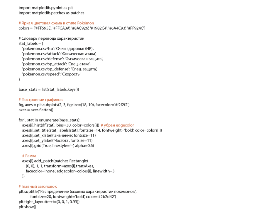 Используются следующие виды визуализации: (1) диаграммы, показывающие распределение базовых характеристик покемонов; (2) тепловая карта, отображающая топ-10 сильнейших корреляций между числовыми признаками; (3) violin-плоты, отображающие распределение признаков для топ-10 корректирующих переменных; (4) рассеяная диаграмма, визуализирующая зависимости разных показателей, например, количество очков здоровья от роста опыта; (5) столбиковая диаграмма, показывающая какие основные типы покемонов являются наиболее сильными или слабыми; (6) горизонтальный barplot, отображающий, насколько часто встречаются легендарные в рамках каждого типа; (7) небольшие таблицы, отображающие сортировку данных