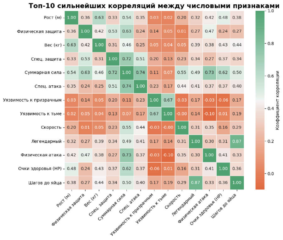 Суммарная сила (base_total) логично коррелирует с всеми боевыми характеристиками (спец. защита, физ. атака, HP и др.). Физические параметры (рост и вес) умеренно коррелируют с HP и боевыми характеристиками. Легендарность покемона тесно связана с высокой стоимостью выведения (шаги до яйца). Уязвимость к типам (призрачный, тьма) практически не коррелирует с другими числовыми параметрами.