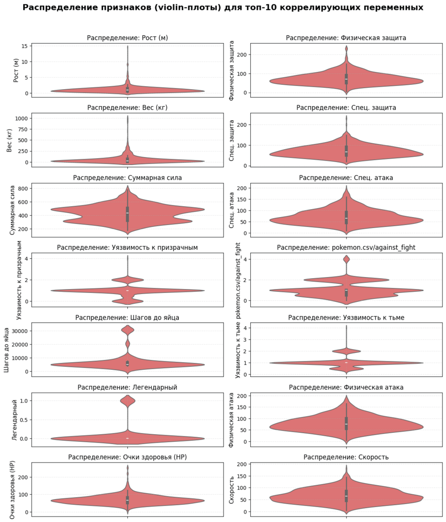Violin-графики показывают, что большинство признаков имеют явно выраженные моды и хвосты, особенно у легендарных, крупных и сильных покемонов. Некоторые переменные (например, уязвимость, легендарность, шагов до яйца) носят дискретный или мультиуровневый характер, что важно учитывать при моделировании.