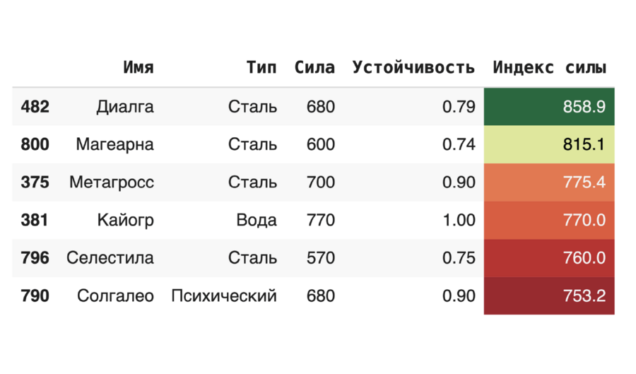 Критерии отбора: (1) Сила — сумма базовых характеристик (HP, атака, защита и т. д.). (2) Устойчивость — средняя уязвимость к атакам всех типов. (3) Индекс силы = Сила / Устойчивость — итоговая метрика.