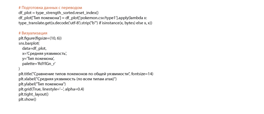 Что было сделано: (1) Использовались признаки against_*, которые показывают, насколько сильно покемоны получают урон от каждого типа атаки. (2) Для каждого основного типа (type1) посчитан средний входящий урон от всех атакующих типов. (3) Чем ниже средняя уязвимость, тем устойчивее тип в целом.