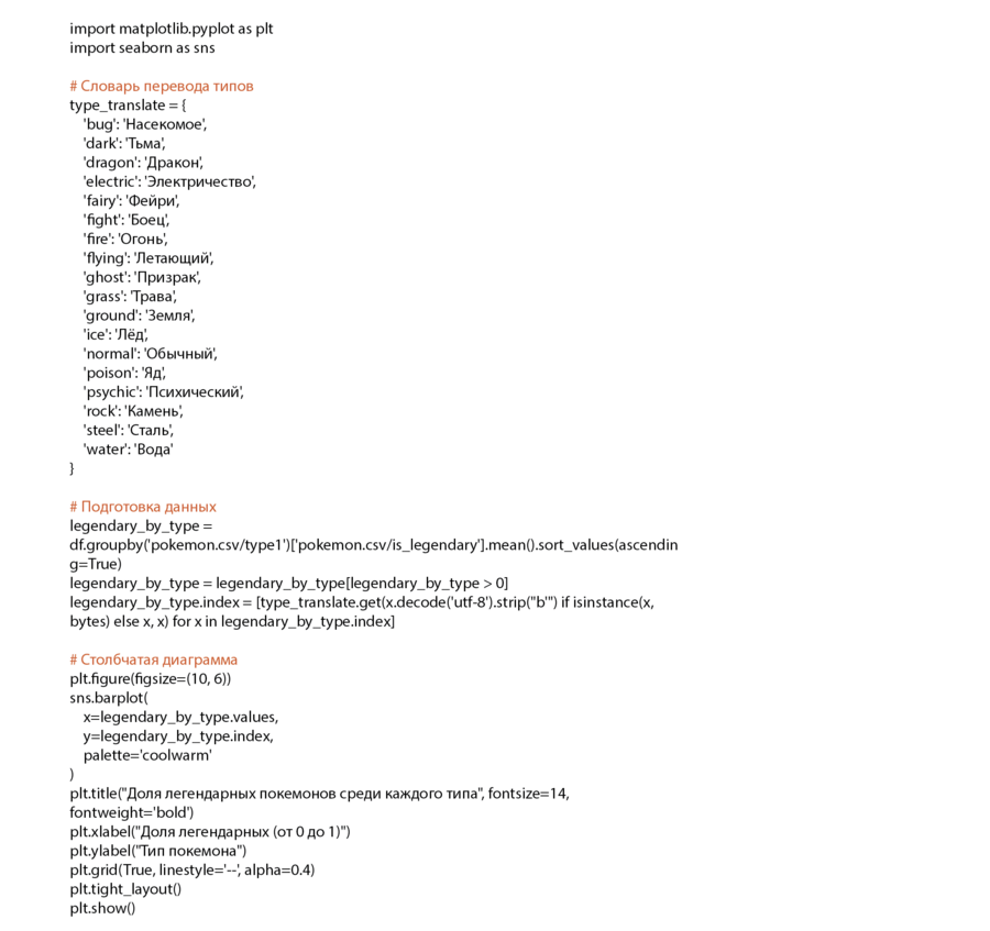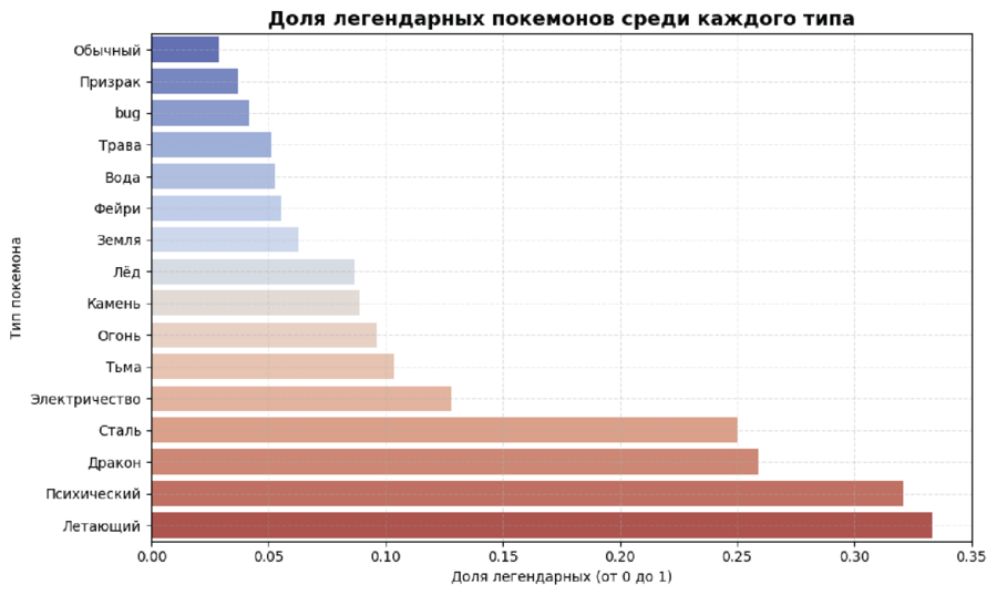 Что было сделано: (1) Посчитана доля легендарных покемонов (is_legendary = 1) в каждом типе type1. (2) Построен горизонтальный barplot, отображающий, насколько часто встречаются легендарные в рамках каждого типа.