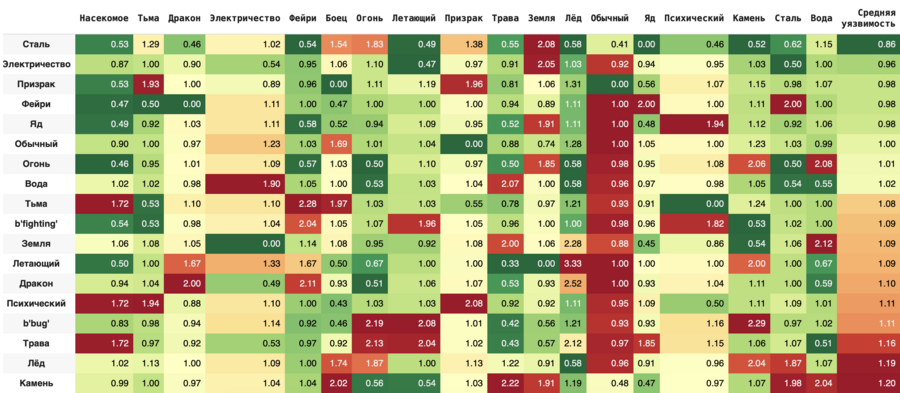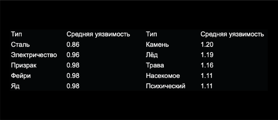 «Сталь», «Призрак», «Фейри» — наиболее сбалансированные и устойчивые типы покемонов в боях. В то время как «Камень», «Лёд» и «Трава» страдают от множества слабостей и, в среднем, получают значительно больше урона.