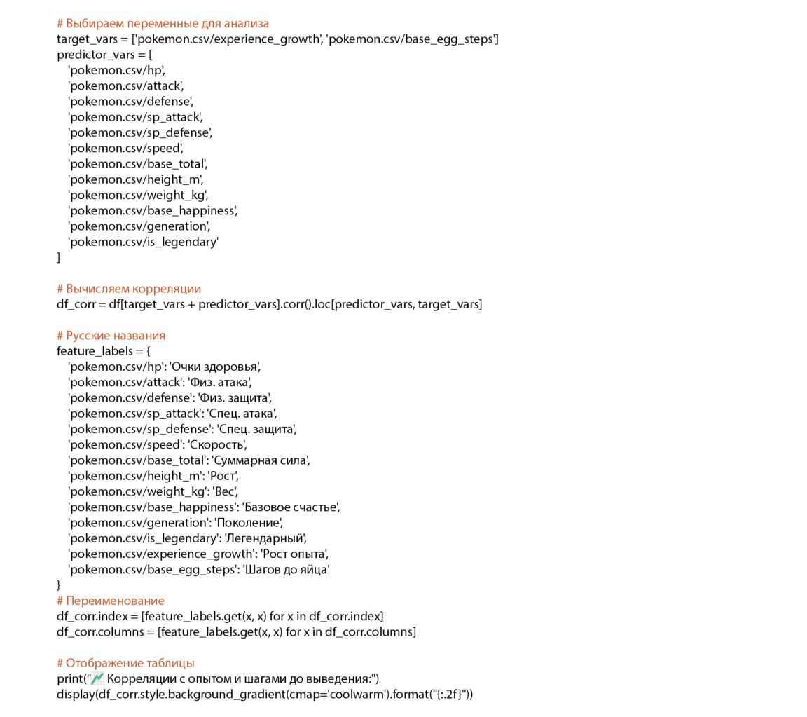 План исследования: (1) Проверить корреляции признаков с переменными: — рост (height_m) — вес (weight_kg) — базовые характеристики (hp, attack, base_total и др.) — тип (type1) — поколение (generation) — базовое счастье (base_happiness) — легендарность (is_legendary) (2) Построить корреляционную таблицу и визуализации (violin / scatter plots). (3) Сформулировать выводы: — какие признаки объясняют сложность прокачки? — что влияет на количество шагов для выведения?