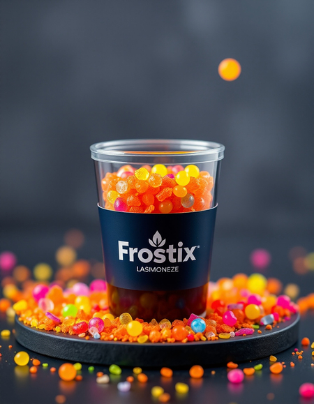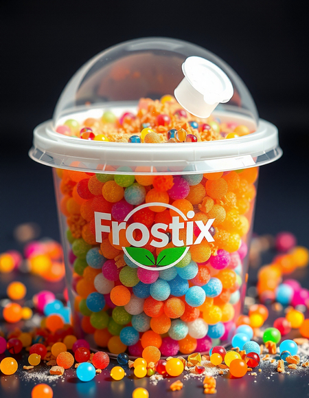 Imagine prompt: Design an advanced, style small plastic tumbler with granulated nanofreeze micro balls with the logo for the Frostix brand. The packaging of the tumbler has a creative playful youthful bright modern design featuring a pattern of circles. Granulated nanofreeze color bright yellow, green, cyan, magenta, orange.