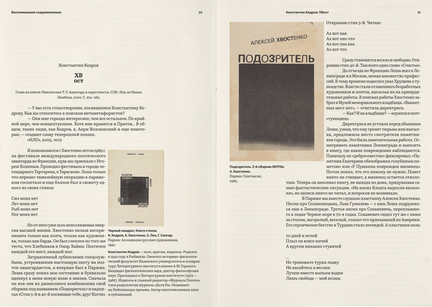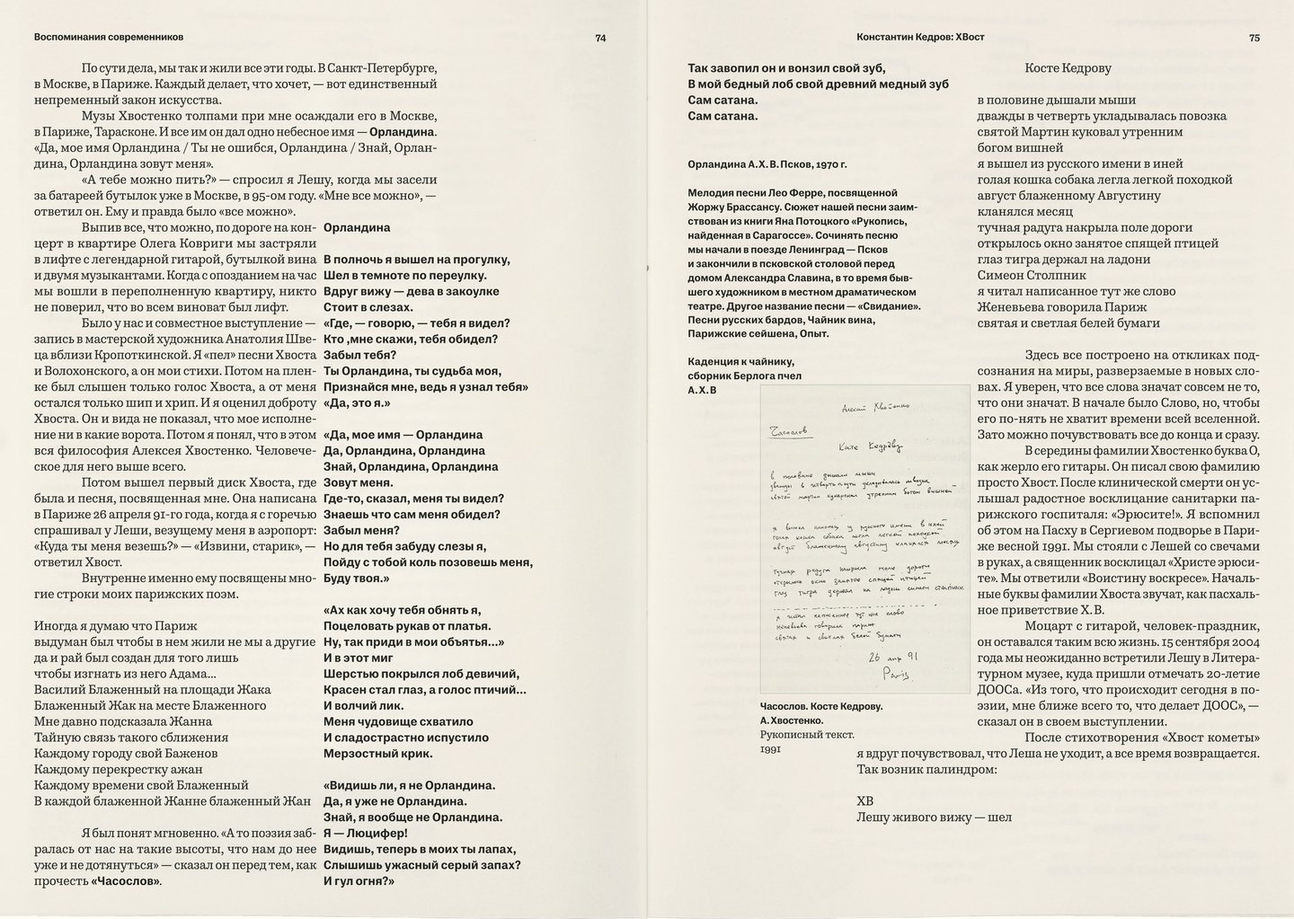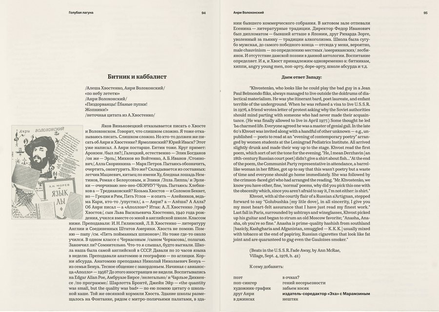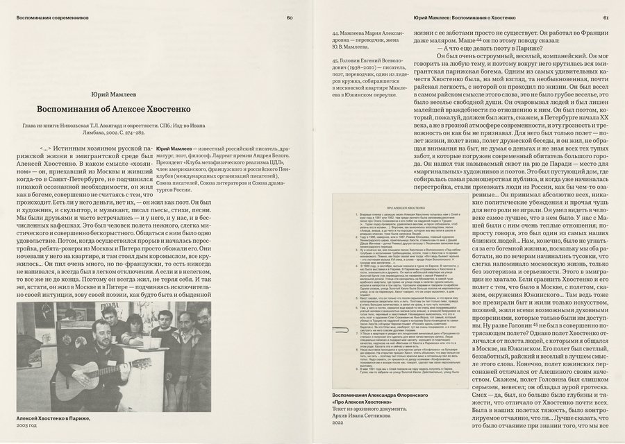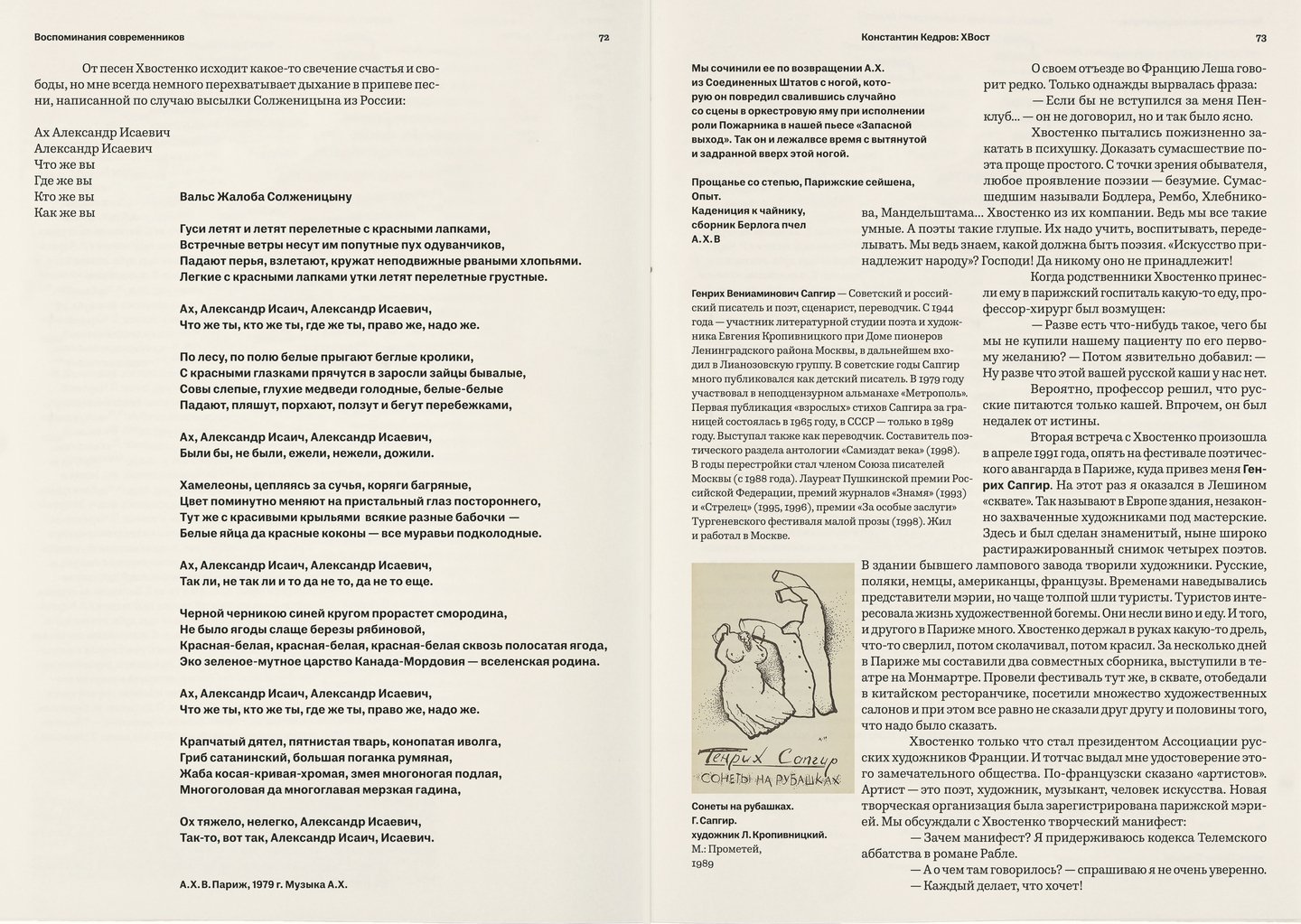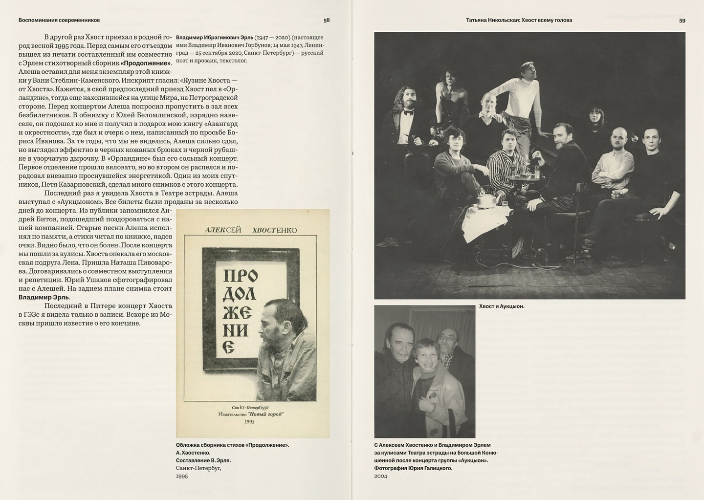 Alexei Khvostenko (Host) is a poet, songwriter, dramatist and artist. The book contains interviews, the memories of contemporary heroes, the literary part with the works in free form, the autobiographical prose of A. H. and his biography. The texts of the poems cited by the authors of the memoirs are also included as footnotes. The idea of the book is to display the multi-vote and community of people from an unofficial Russian culture who have ever come into contact with Alexei Khvostenko.