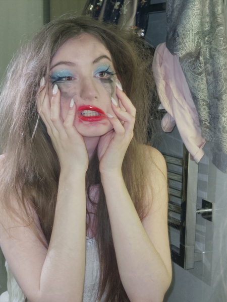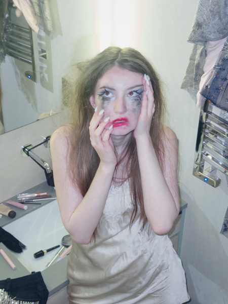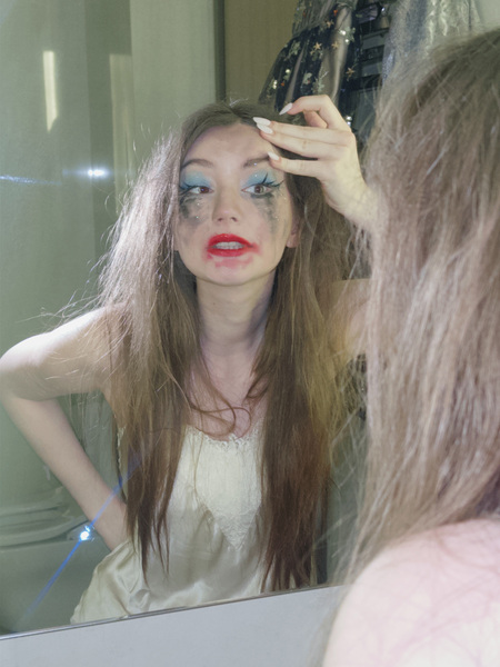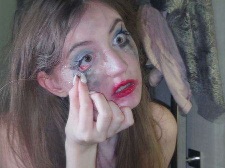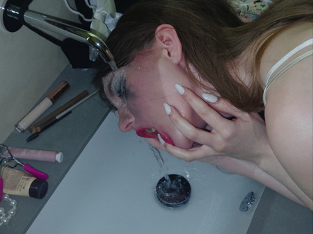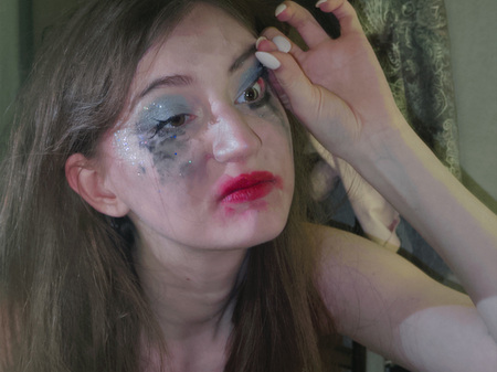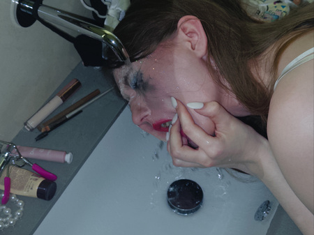 Ритуалы красоты становятся для нее актом ухода, а насилием над собой. Она одновременно не приемлет естественную внешность, верит в достижение идеала через косметику и видит, что макияж — это лишь кривая маска.