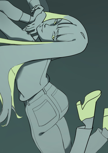 Рисуя двойника я подчёркиваю её качества femme fatale: лукавую улыбку, пластику и изгибы фигуры. В изображении настоящей Золушки — уделяю внимание её сутулости, истощённости. Её силуэт нагруженный, а мимика чаще утомлённая и угрюмая.