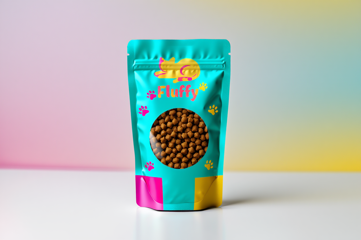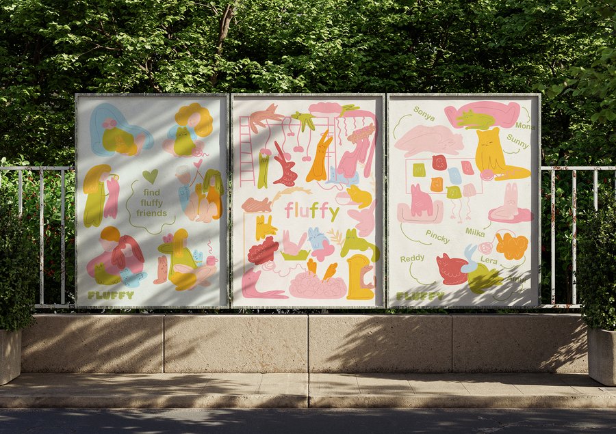 The color palette consists of gentle pastel shades, including soft blue, pink, yellow, and green. These colors create a cheerful and inviting vibe, appealing to both cat lovers and cafe-goers. The name «Fluffy» is written in a whimsical, rounded font that complements the cat’s silhouette, with the letters slightly varying in height to add a playful touch.