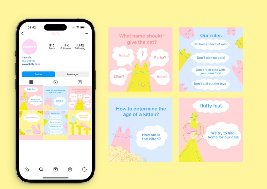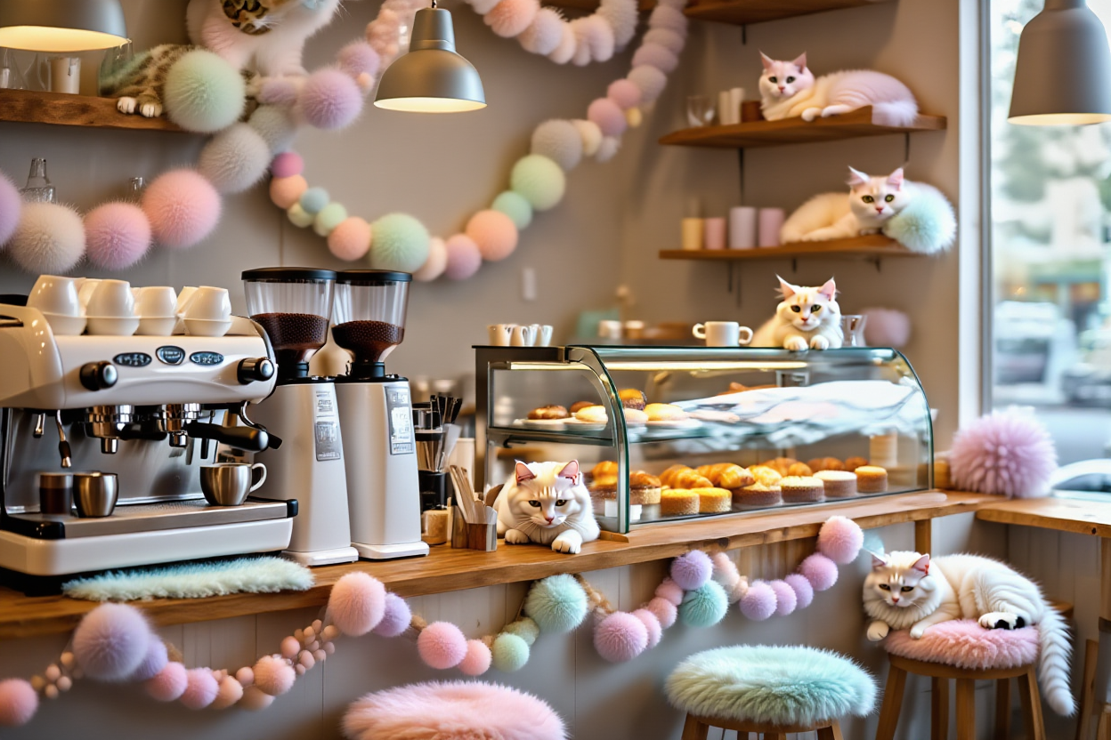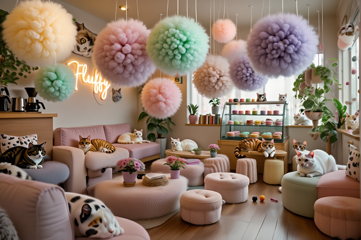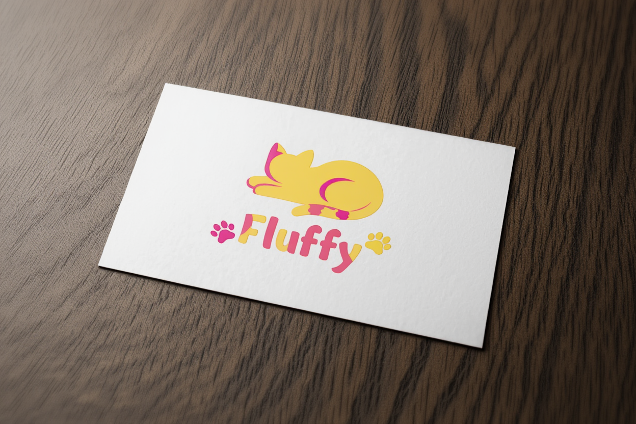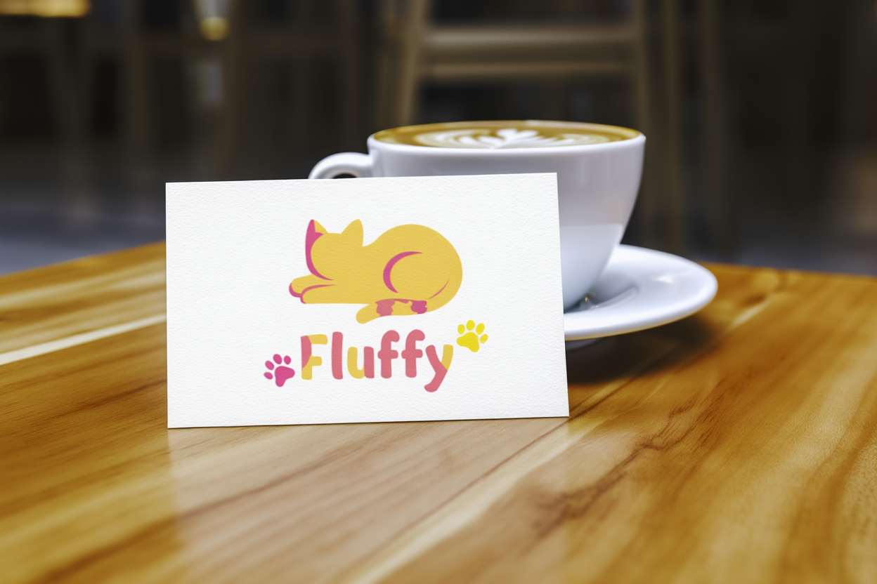 Design a brand identity for 'Fluffy, ' a cozy cat café. The identity should reflect warmth, friendliness, and a love for cats. Create a logo that incorporates playful elements, such as a stylized cat silhouette or paw prints, using soft and inviting colors like pastel pinks, blues, and creams. Develop complementary branding materials, including business cards, menus, and coffee cup designs, showcasing the logo and color palette. Additionally, create realistic mockups of these materials in a café setting, including a storefront sign, staff uniforms, and merchandise like tote bags or t-shirts. The goal is to convey a welcoming atmosphere that invites customers to enjoy coffee and the company of cats while establishing 'Fluffy' as a beloved community spot.